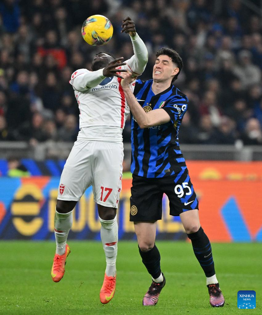 Alessandro Bastoni (R) of Inter Milan vies with Keita Balde of Monza during a Serie A football match between Inter Milan and Monza in Milan, Italy, March 8, 2025. (Photo by Alberto Lingria/Xinhua)