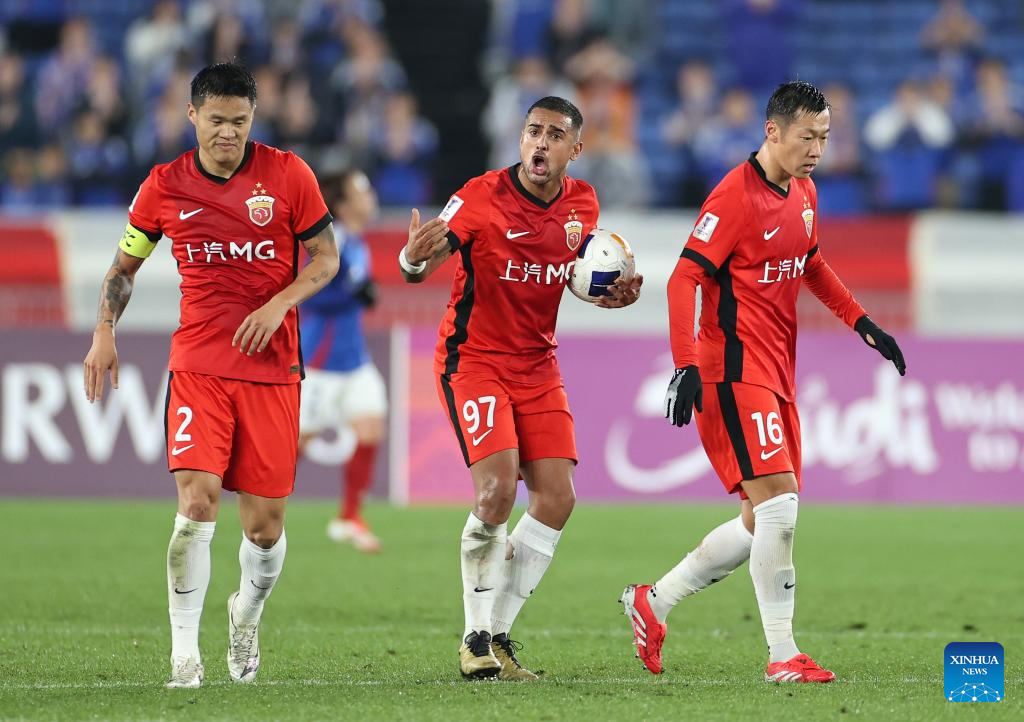 Leonardo (R) of Shanghai Port reacts during the round of 16 second leg match of AFC Champions League Elite between Yokohama F. Marinos of Japan and Shanghai Port of China in Yokohama, Japan, March 11, 2025. (Xinhua/Jia Haocheng)