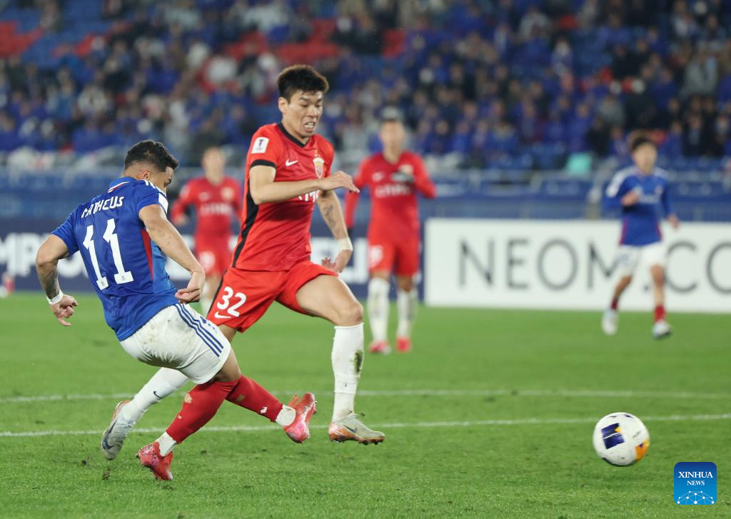 Yan Matheus (L) of Yokohama F. Marinos shoots to score during the round of 16 second leg match of AFC Champions League Elite between Yokohama F. Marinos of Japan and Shanghai Port of China in Yokohama, Japan, March 11, 2025. (Xinhua/Jia Haocheng)