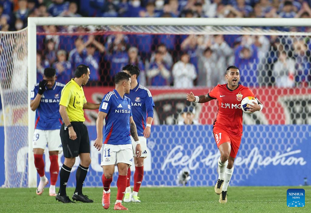 Leonardo (C) of Shanghai Port reacts after scoring during the round of 16 second leg match of AFC Champions League Elite between Yokohama F. Marinos of Japan and Shanghai Port of China in Yokohama, Japan, March 11, 2025. (Xinhua/Jia Haocheng)