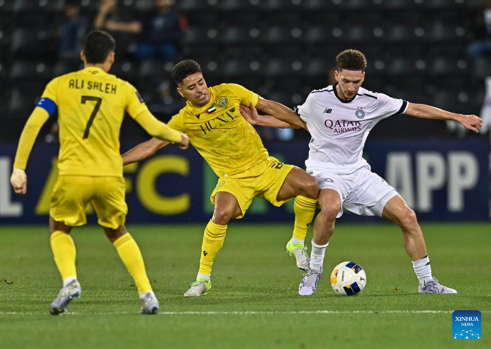 Moustafa Tarek Mashal (R) of Al Sadd SC vies with Geronimo Poblete (C) of Al Wasl FC during the AFC Champions League Elite Round of 16 2nd Leg football match between Qatar's Al Sadd SC and United Arab Emirate's Al Wasl FC at Jassim Bin Hamad Stadium in Doha, Qatar, March 10, 2025. (Photo by Nikku/Xinhua)