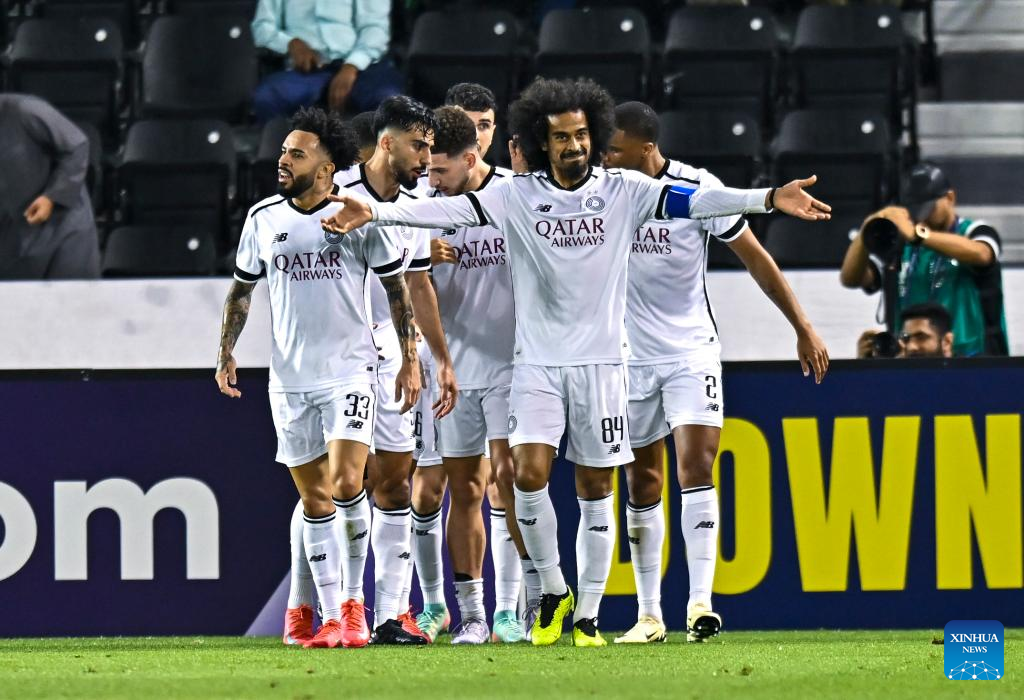 Akram Afif (2nd R) of Al Sadd SC celebrates with teammates after scoring during the AFC Champions League Elite Round of 16 2nd Leg football match between Qatar's Al Sadd SC and United Arab Emirate's Al Wasl FC at Jassim Bin Hamad Stadium in Doha, Qatar, March 10, 2025. (Photo by Nikku/Xinhua)