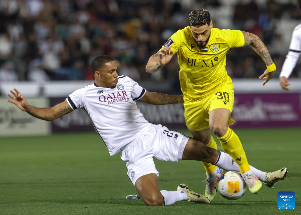 Pedro Miguel Correia (L) of Al Sadd SC vies with Joao Pedro of Al Wasl FC during the AFC Champions League Elite Round of 16 2nd Leg football match between Qatar's Al Sadd SC and United Arab Emirate's Al Wasl FC at Jassim Bin Hamad Stadium in Doha, Qatar, March 10, 2025. (Photo by Nikku/Xinhua)