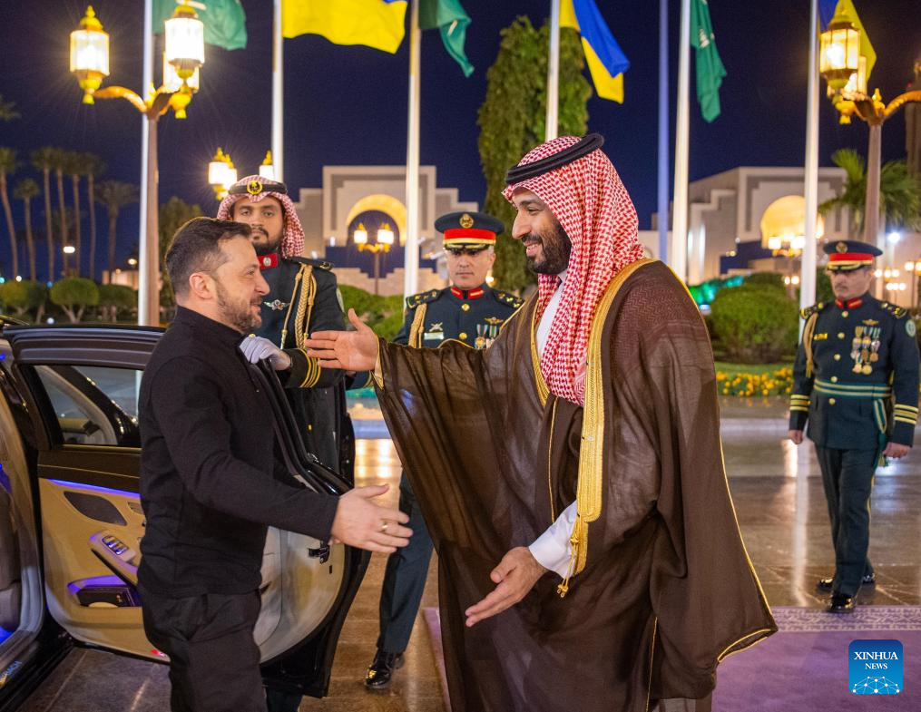 The SPA said on social media platform X that the Saudi crown prince received the Ukrainian president at the Al-Salam Palace in Jeddah, where an official reception ceremony was held. The two leaders also held formal talks. (SPA/Handout via Xinhua)