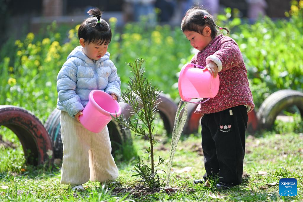 Children water seedlings at a kindergarten ahead of the National Tree Planting Day which falls on March 12 in Nanjing, east China's Jiangsu Province, March 11, 2025. (Photo by Fang Dongxu/Xinhua)