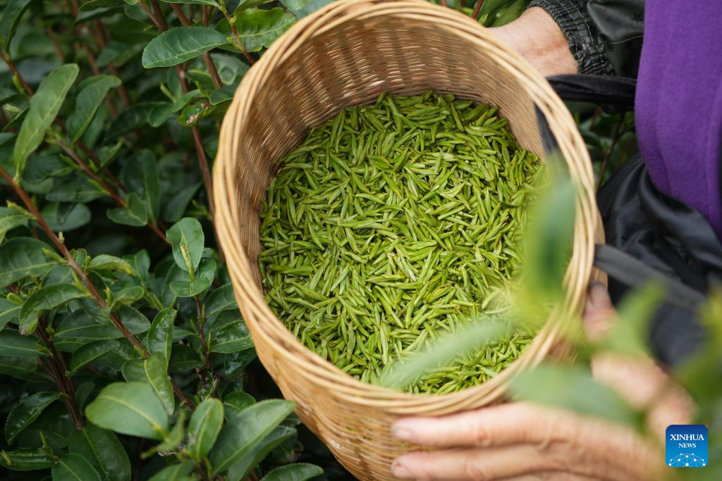 A farmer displays the newly picked tea leaves in Xiayanbei Village of Dongming Township, Xinchang County of east China's Zhejiang Province, March 10, 2025. (Xinhua/Weng Xinyang)