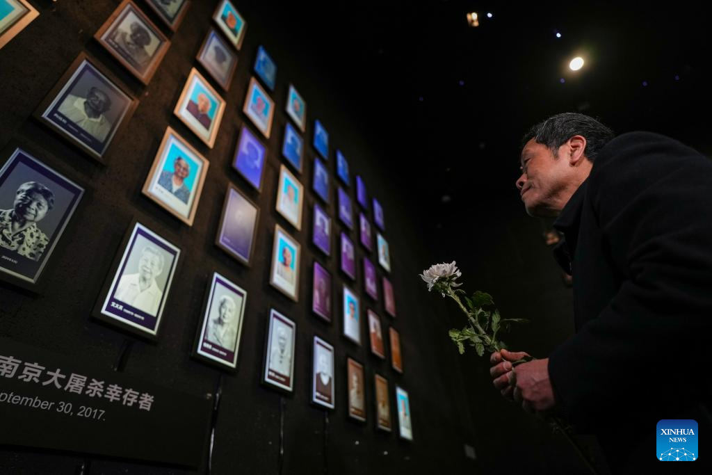 Huang Xinghua, son of Nanjing Massacre survivor Ai Yiying, lays a flower at a "lights out" mourning ceremony held at the Memorial Hall of the Victims in Nanjing Massacre by Japanese Invaders, in Nanjing, east China's Jiangsu Province, March 11, 2025.