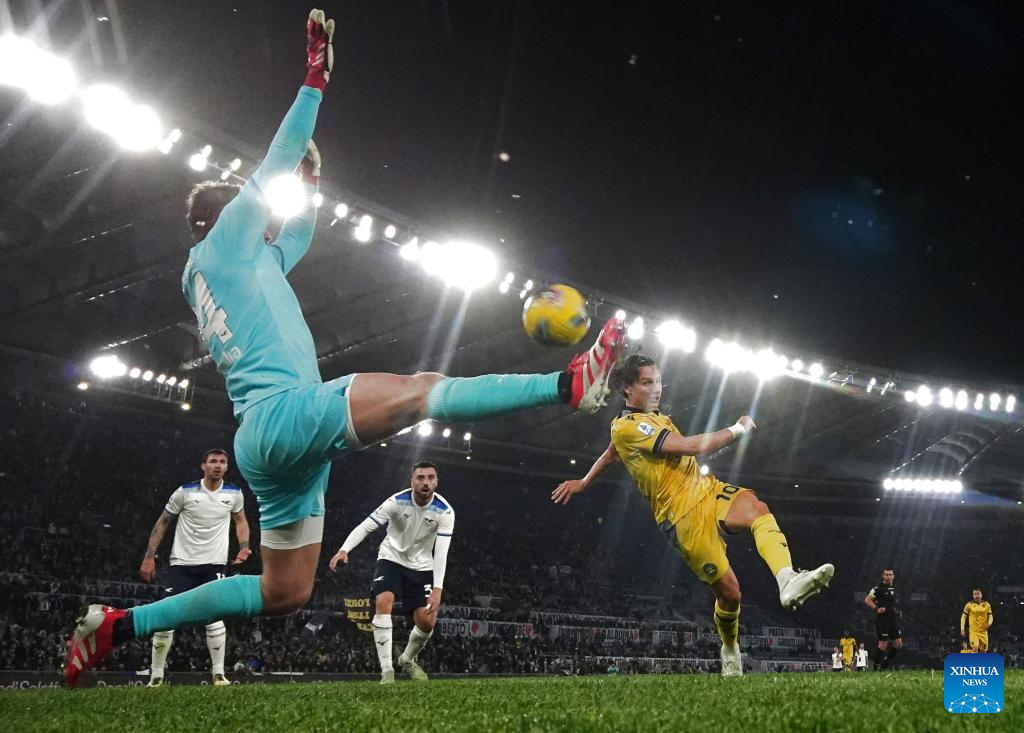 Udinese's Florian Thauvin (R) scores his goal during a Serie A football match between Lazio and Udinese in Rome, Italy, March 10, 2025. (Photo by Alberto Lingria/Xinhua)
