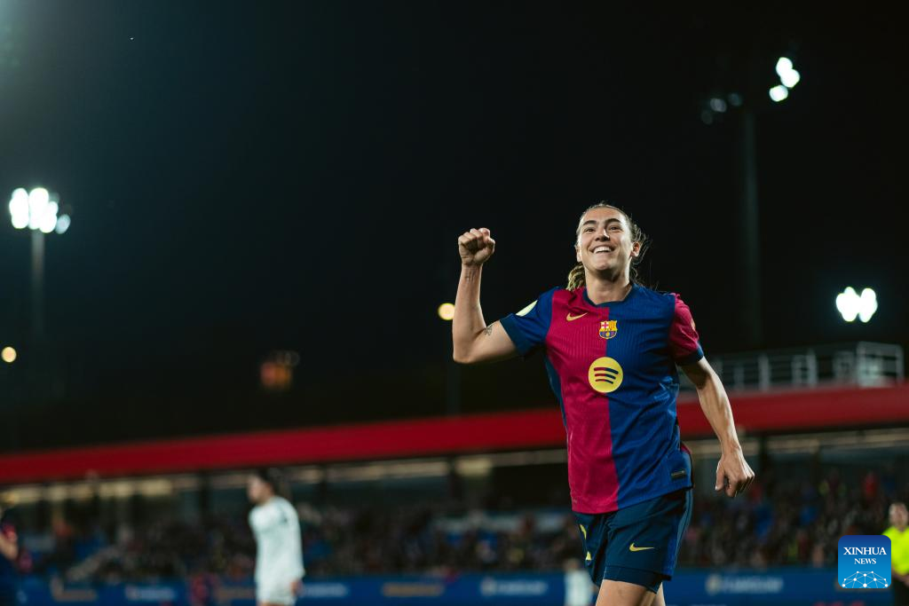 Patri Guijarro of Barcelona celebrates a goal during the Copa de la Reina match between Barcelona and Real Madrid in Barcelona, Spain, on March 12, 2025. (Photo by Joan Gosa/Xinhua)