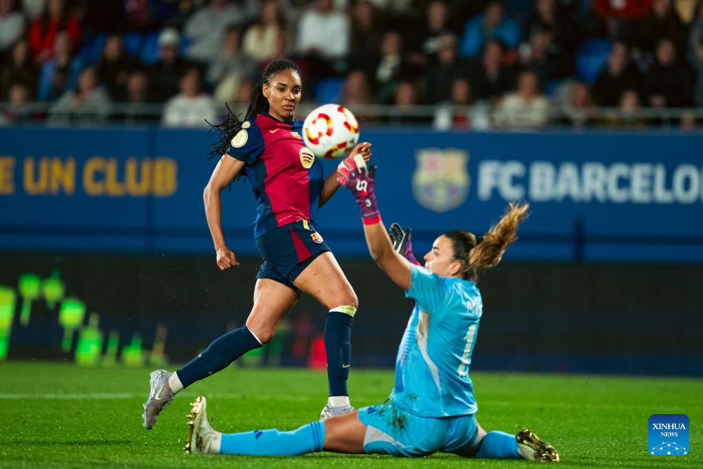 Salma Paralluelo (L) of Barcelona shoots during the Copa de la Reina match between Barcelona and Real Madrid in Barcelona, Spain, on March 12, 2025. (Photo by Joan Gosa/Xinhua)