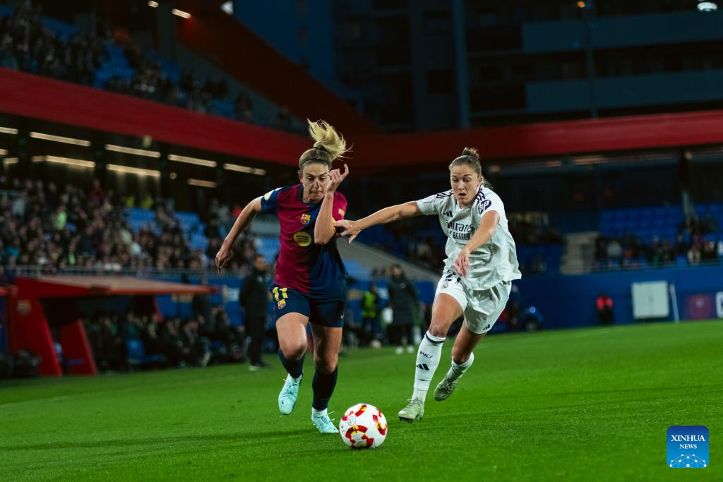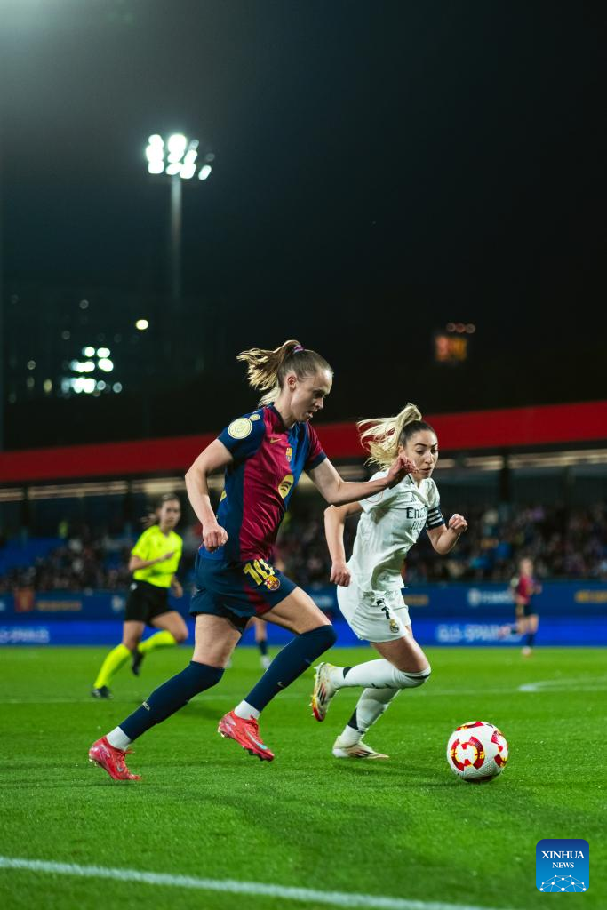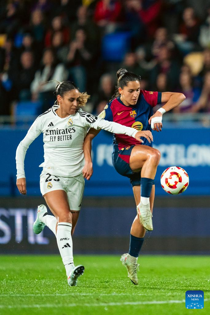 Alexia Putellas (L) of Barcelona vies with Filippa Angeldahl of Real Madrid during the Copa de la Reina match between Barcelona and Real Madrid in Barcelona, Spain, on March 12, 2025. (Photo by Joan Gosa/Xinhua)