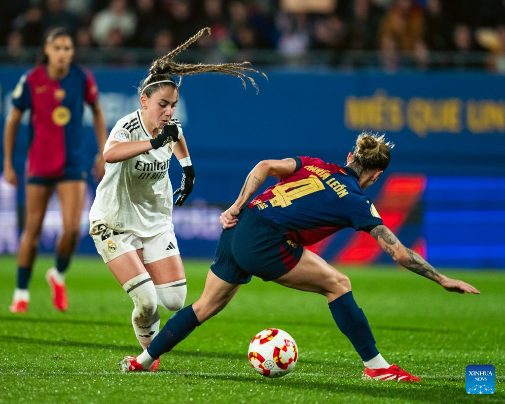 Mapi Leon (R) of Barcelona vies with Del Castillo of Real Madrid during the Copa de la Reina match between Barcelona and Real Madrid in Barcelona, Spain, on March 12, 2025. (Photo by Joan Gosa/Xinhua)