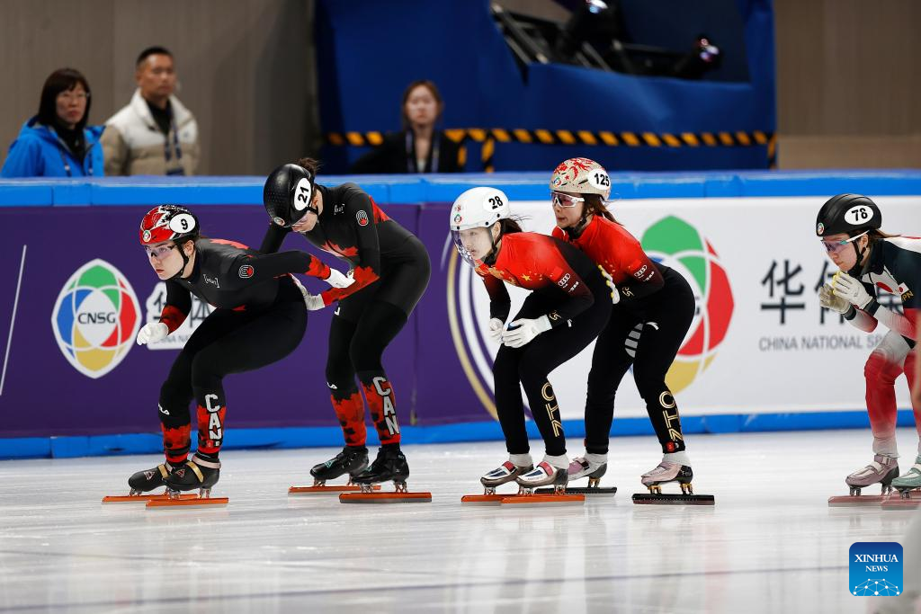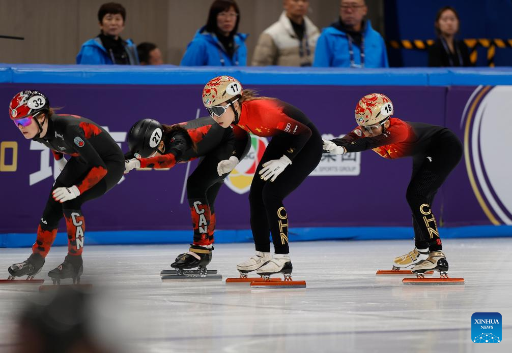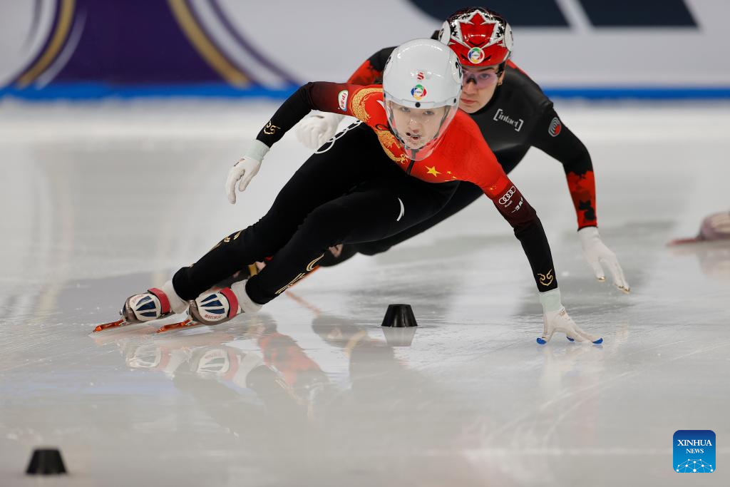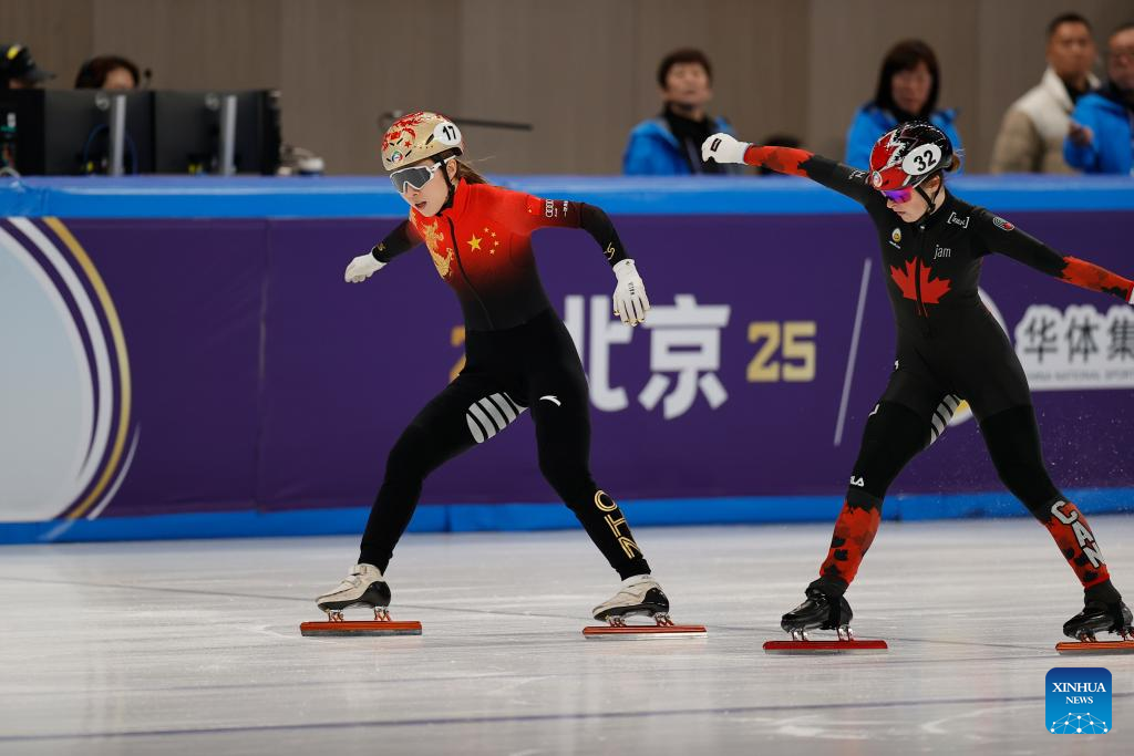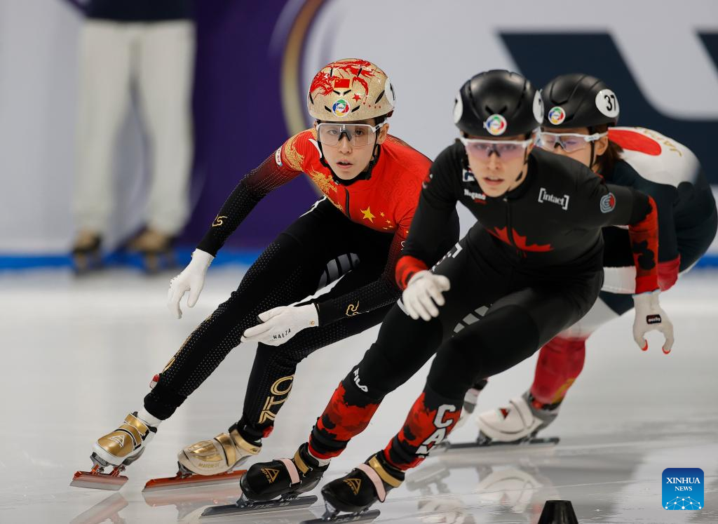 Fan Kexin (1st R), Gong Li of China and Kim Boutin (1st L), Florence Brunelle of Canada compete during the women's 3000m relay quarterfinal at the ISU World Short Track Speed Skating Championships 2025 in Beijing, China, March 14, 2025. (Xinhua/Ding Xu)