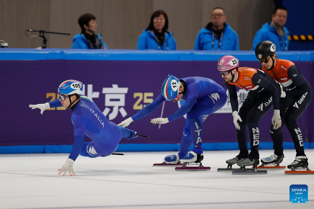 Lorenzo Previtali (1st L) of Italy falls during the men's 5000m relay quarterfinal at the ISU World Short Track Speed Skating Championships 2025 in Beijing, China, March 14, 2025. (Xinhua/Ding Xu)