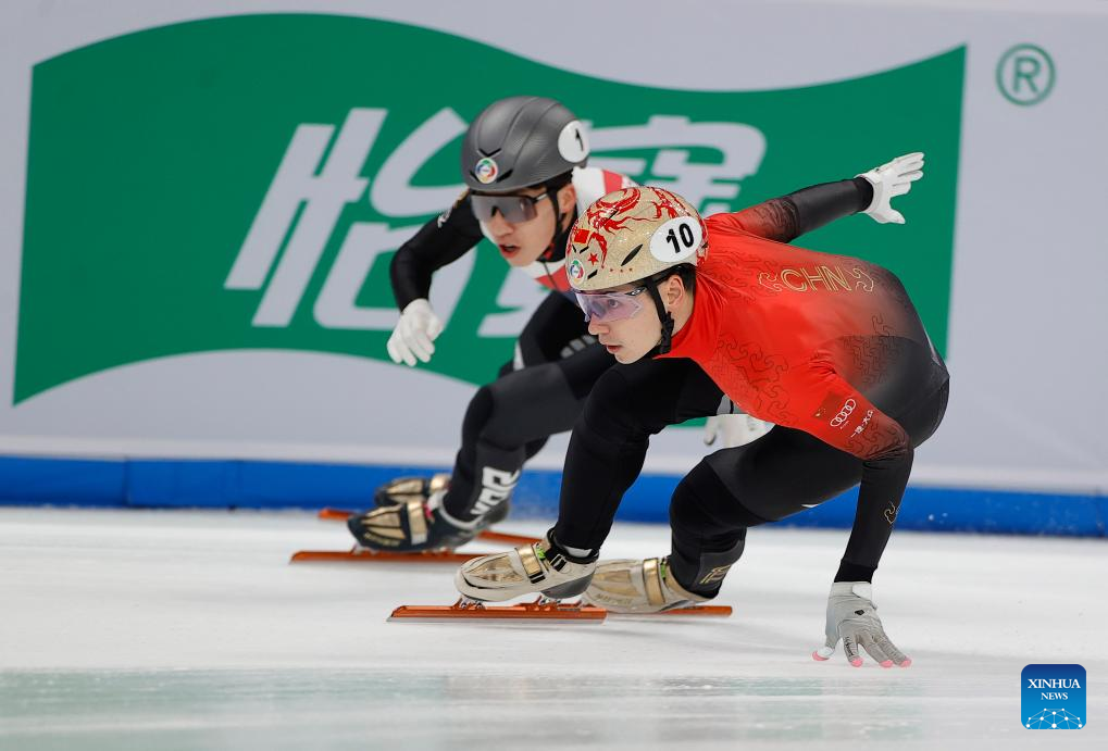 Liu Guanyi of China competes during the men's 5000m relay quarterfinal at the ISU World Short Track Speed Skating Championships 2025 in Beijing, China, March 14, 2025. (Xinhua/Ding Xu)
