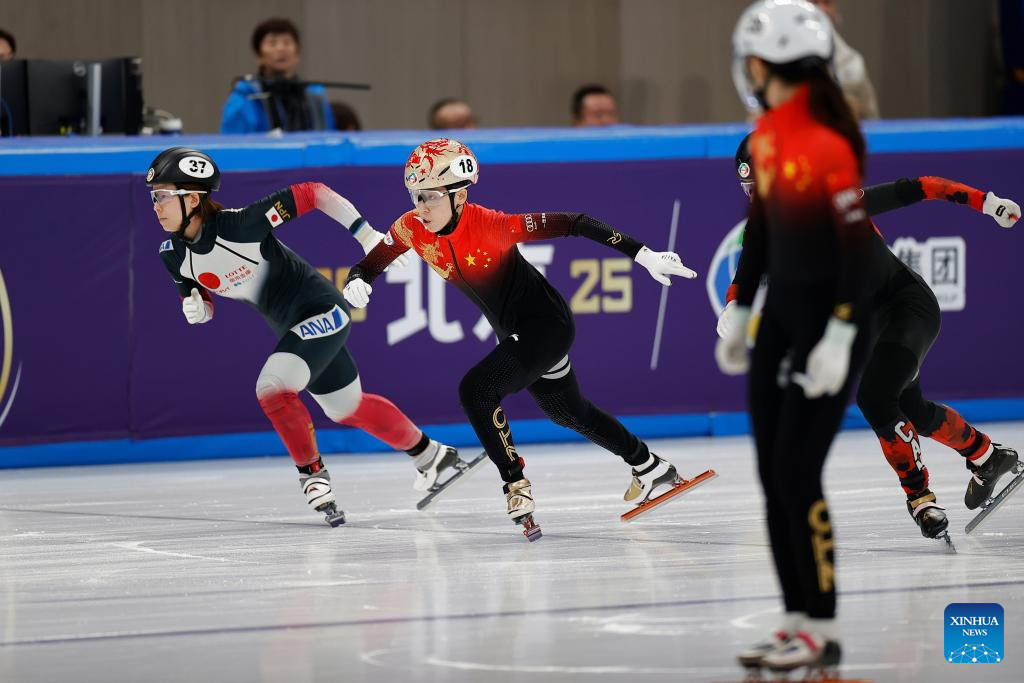 Fan Kexin (2nd L) of China and Hirai Ami of Japan compete during the women's 3000m relay quarterfinal at the ISU World Short Track Speed Skating Championships 2025 in Beijing, China, March 14, 2025. (Xinhua/Ding Xu)