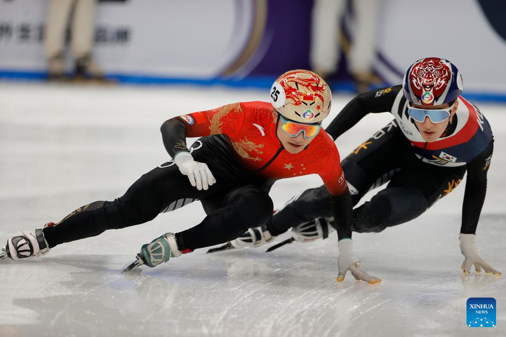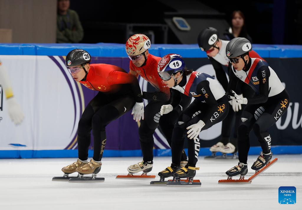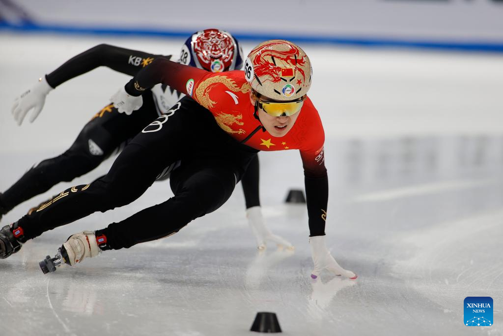 Wang Xinran of China competes during the women's 3000m relay quarterfinal at the ISU World Short Track Speed Skating Championships 2025 in Beijing, China, March 14, 2025. (Xinhua/Ding Xu)