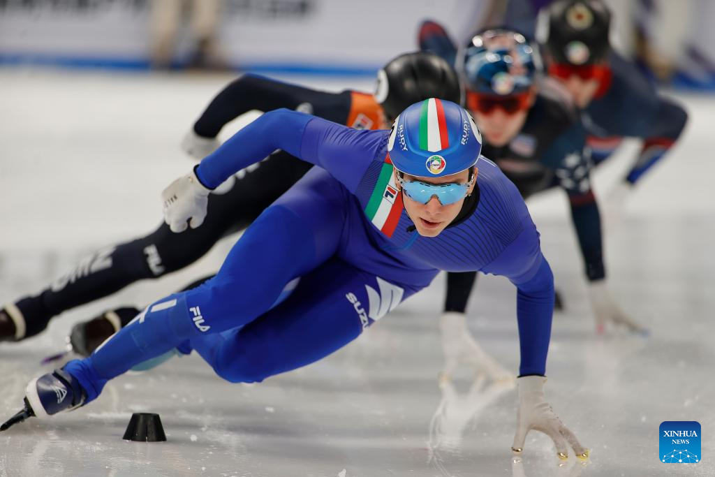 Thomas Nadalini of Italy competes during the men's 5000m relay quarterfinal at the ISU World Short Track Speed Skating Championships 2025 in Beijing, China, March 14, 2025. (Xinhua/Ding Xu)