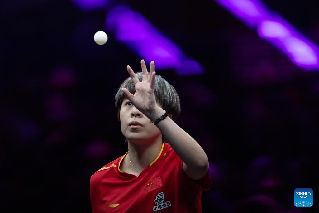 Wang Manyu of China serves during the women's singles round of 16 match against Chien Tung-chuan of Chinese Taipei at the WTT Champions Chongqing 2025 in Chongqing, southwest China, March 14, 2025. (Xinhua/Tang Yi)