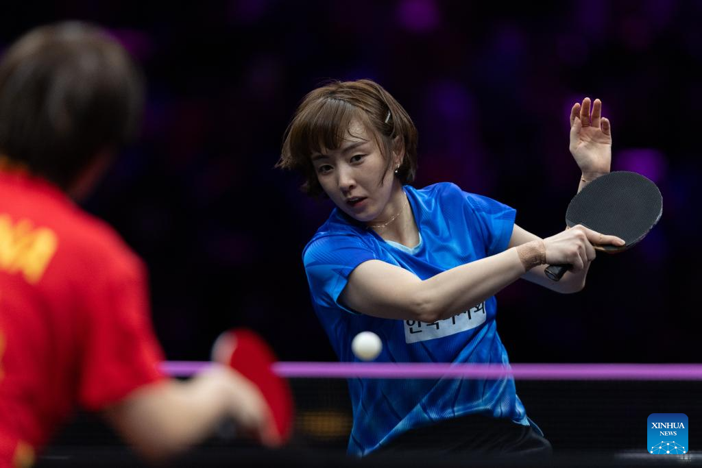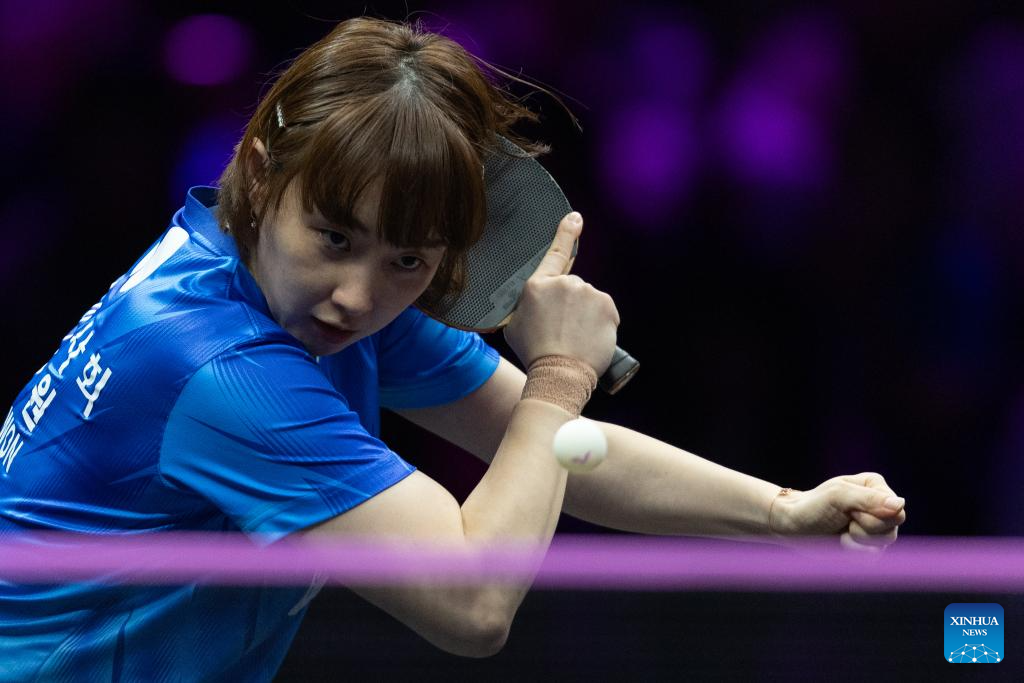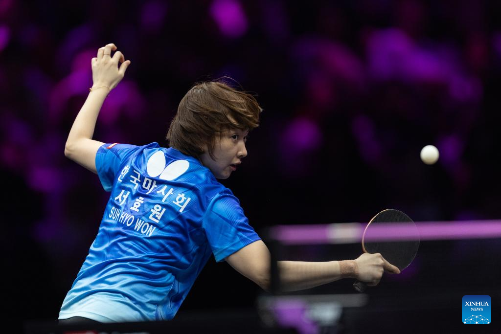 Suh Hyowon hits a return during the women's singles round of 16 match between Wang Yidi of China and Suh Hyowon of South Korea at the WTT Champions Chongqing 2025 in Chongqing, southwest China, March 14, 2025. (Xinhua/Huang Wei)