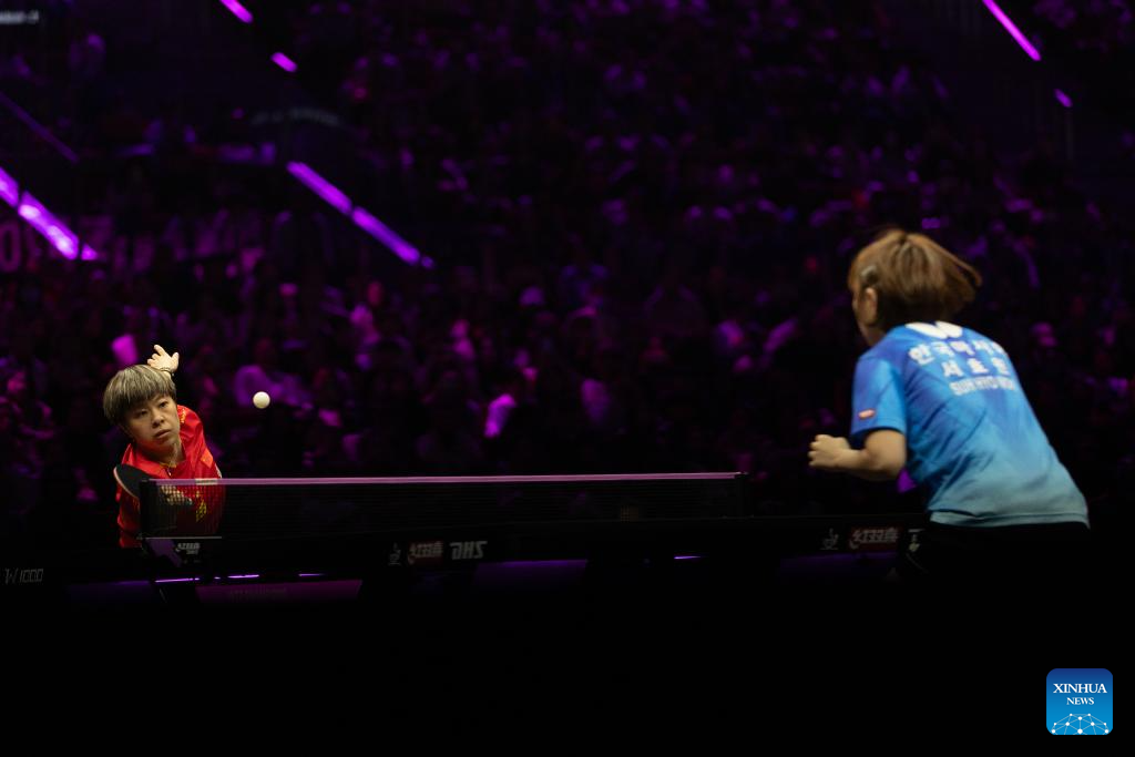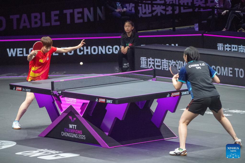 Wang Manyu (L) of China hits a return during the women's singles round of 16 match against Chien Tung-chuan of Chinese Taipei at the WTT Champions Chongqing 2025 in Chongqing, southwest China, March 14, 2025. (Xinhua/Tang Yi)