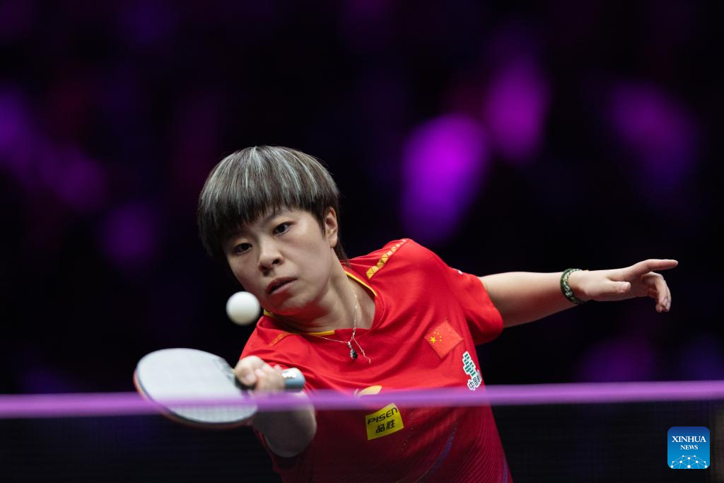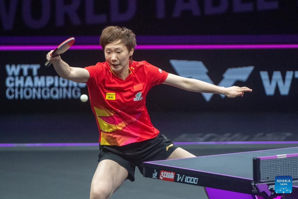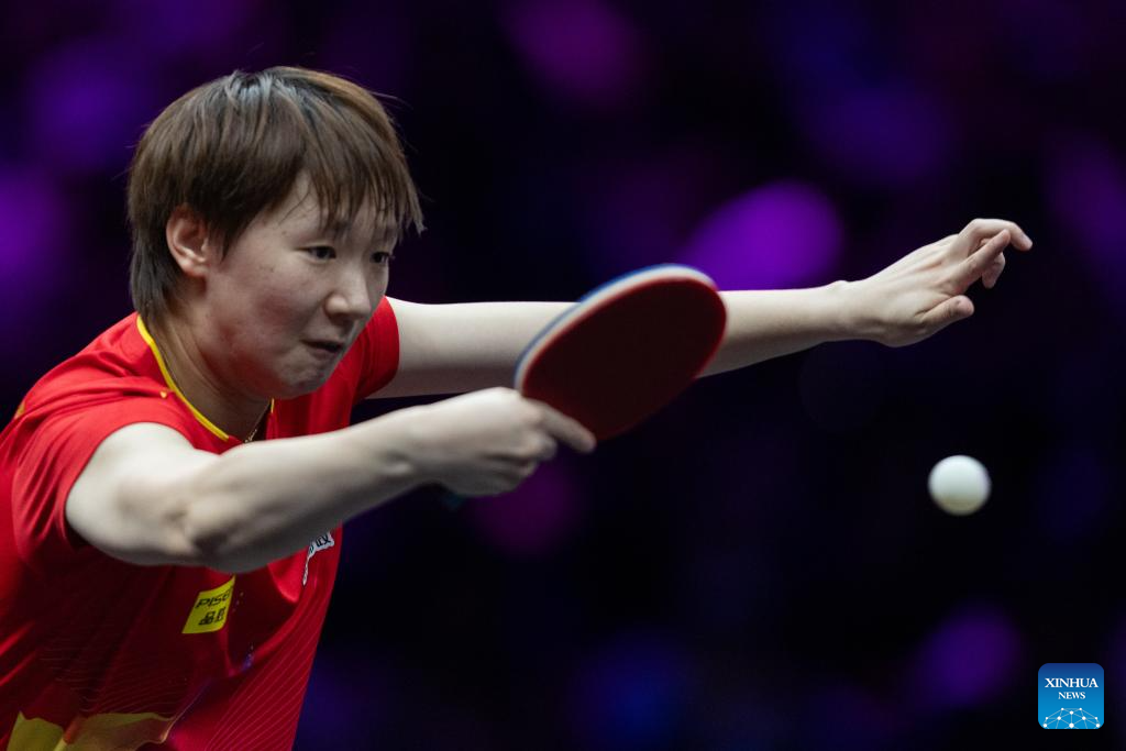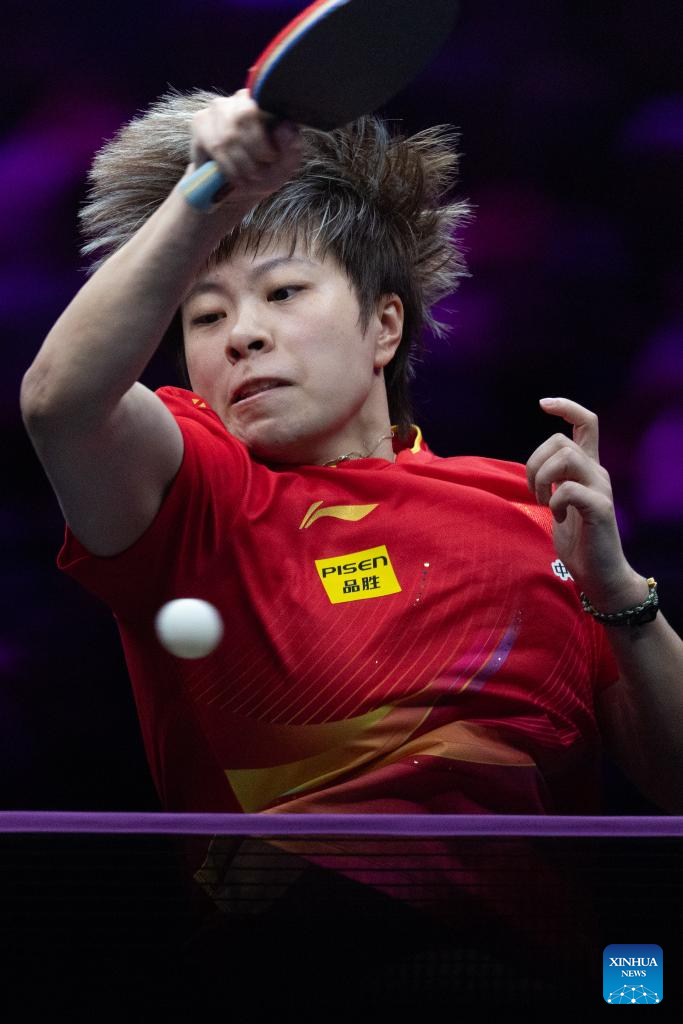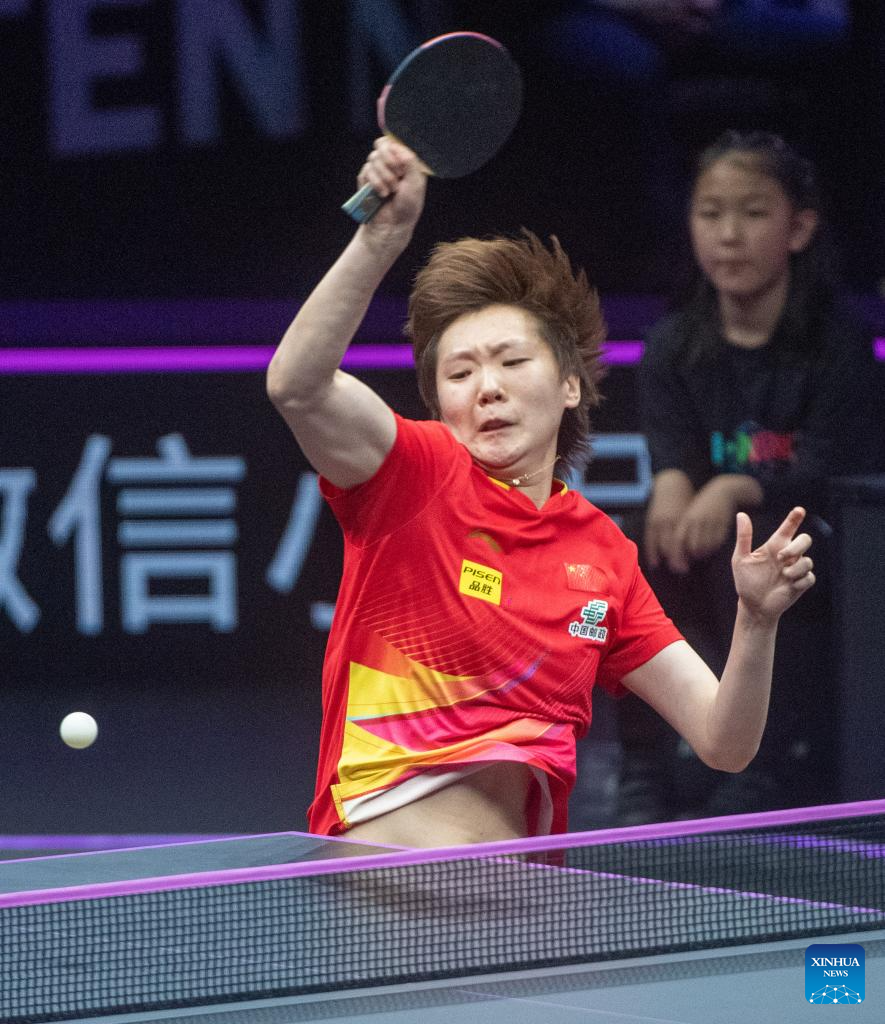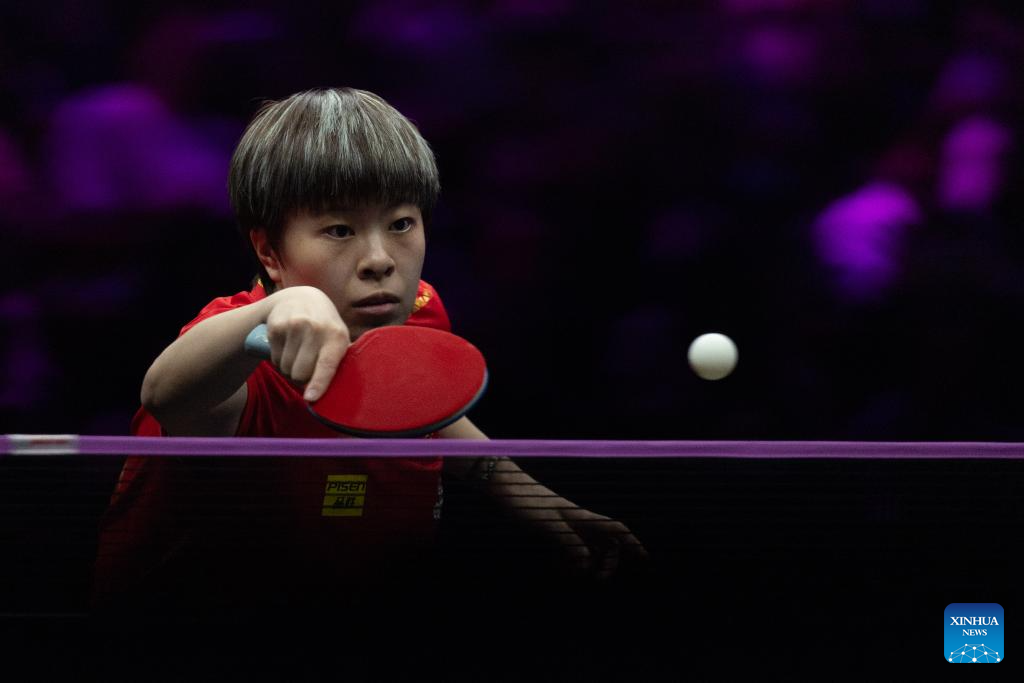 Kuai Man hits a return during the women's singles round of 16 match between Kuai Man of China and Maria Xiao of Spain at the WTT Champions Chongqing 2025 in Chongqing, southwest China, March 14, 2025. (Xinhua/Huang Wei)