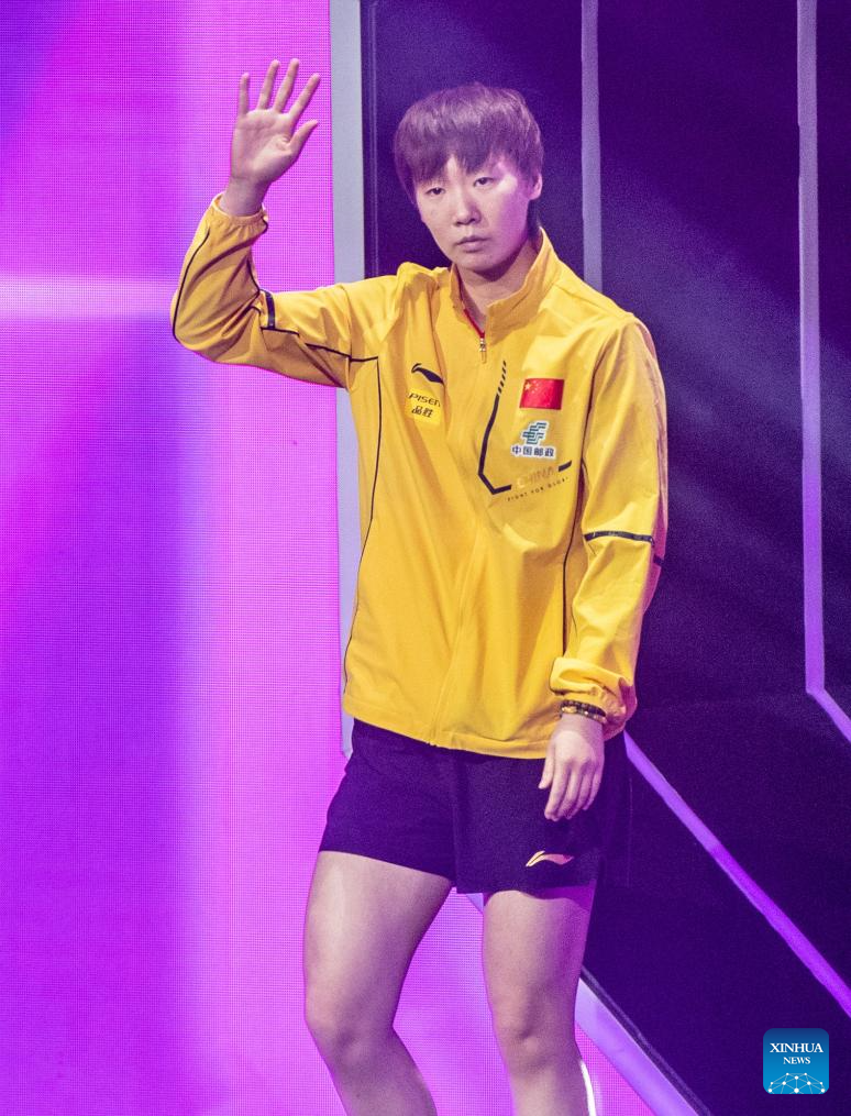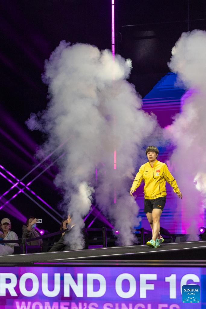 Wang Yidi steps into the court prior to the women's singles round of 16 match between Wang Yidi of China and Suh Hyowon of South Korea at the WTT Champions Chongqing 2025 in Chongqing, southwest China, March 14, 2025. (Xinhua/Huang Wei)