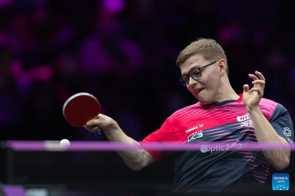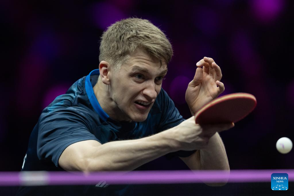 Anton Kallberg hits a return during the men's singles round of 16 match between Harimoto Tomokazu of Japan and Anton Kallberg of Sweden at the WTT Champions Chongqing 2025 in Chongqing, southwest China, March 14, 2025. (Xinhua/Huang Wei)