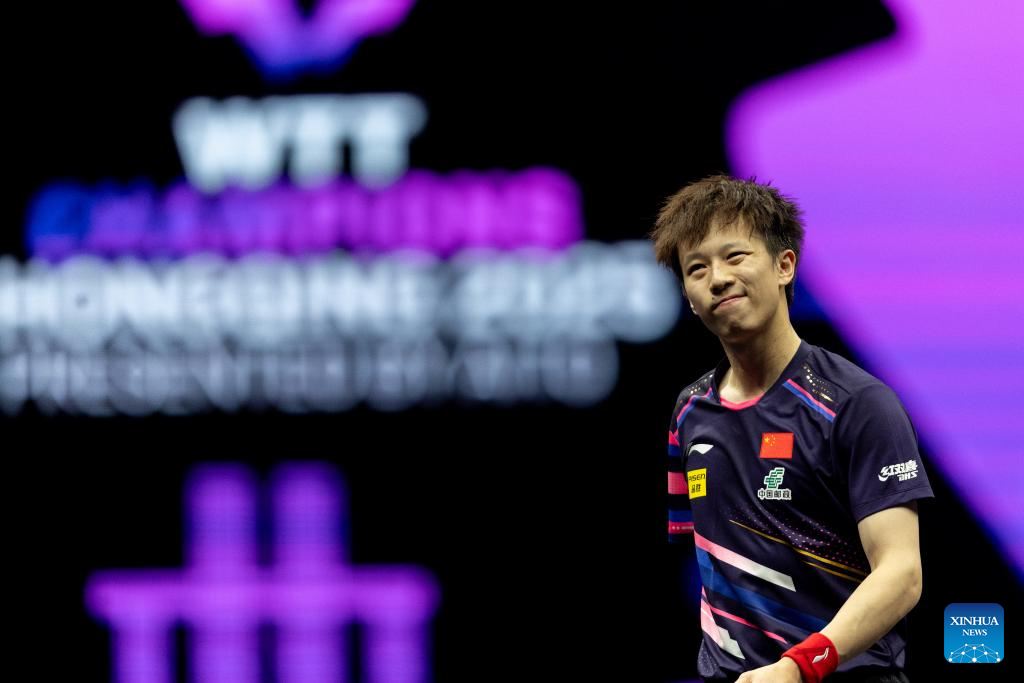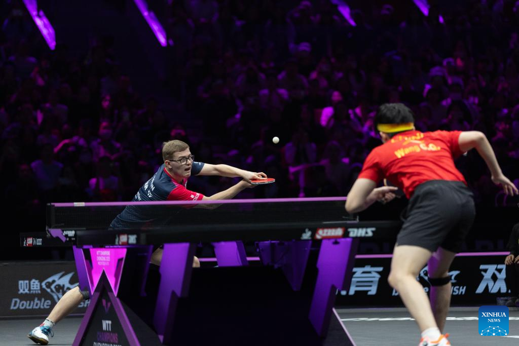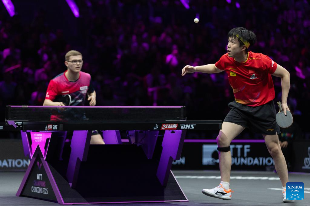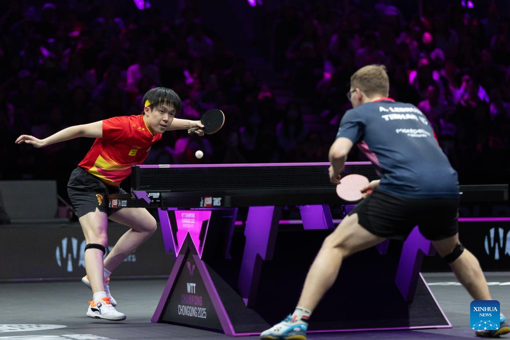 Wang Chuqin (L) hits a return during the men's singles round of 16 match between Wang Chuqin of China and Alexis Lebrun of France at the WTT Champions Chongqing 2025 in Chongqing, southwest China, March 14, 2025. (Xinhua/Huang Wei)