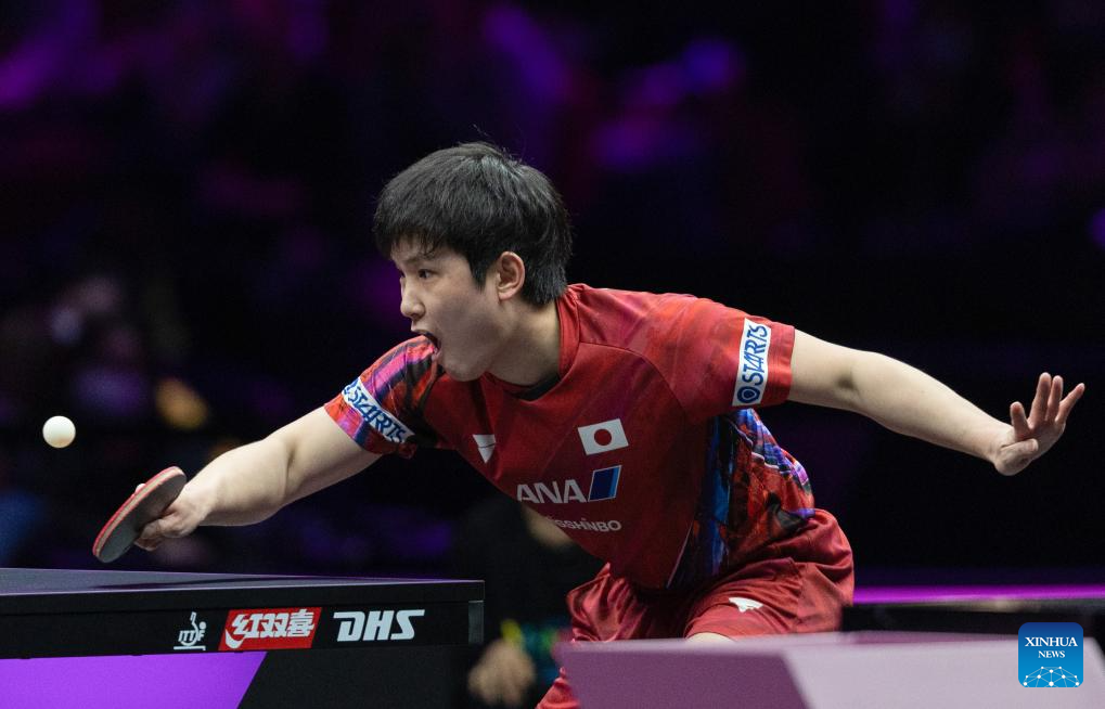 Harimoto Tomokazu hits a return during the men's singles round of 16 match between Harimoto Tomokazu of Japan and Anton Kallberg of Sweden at the WTT Champions Chongqing 2025 in Chongqing, southwest China, March 14, 2025. (Xinhua/Huang Wei)