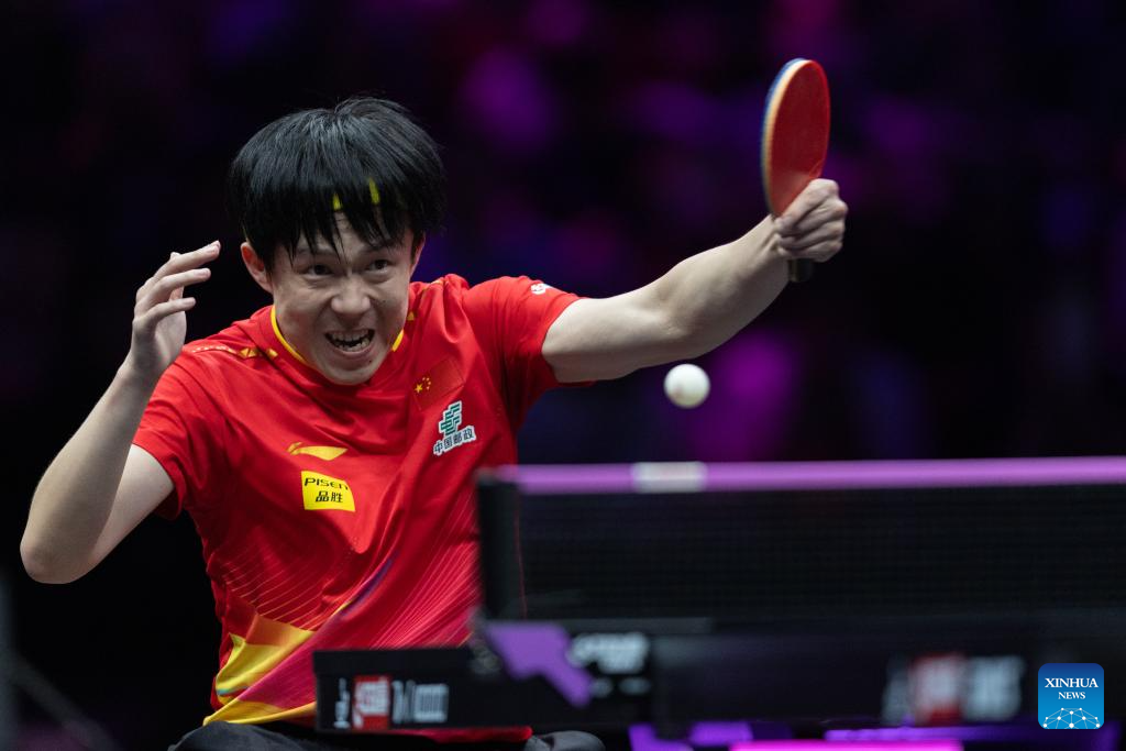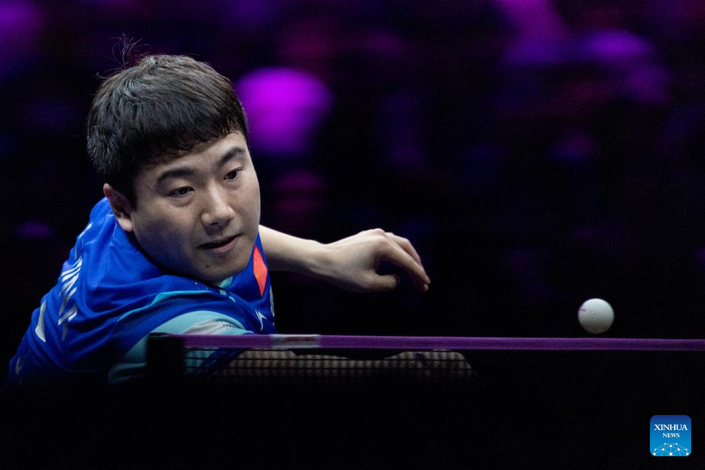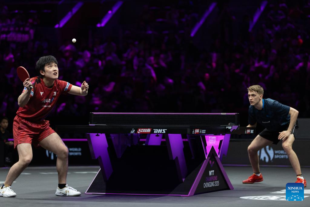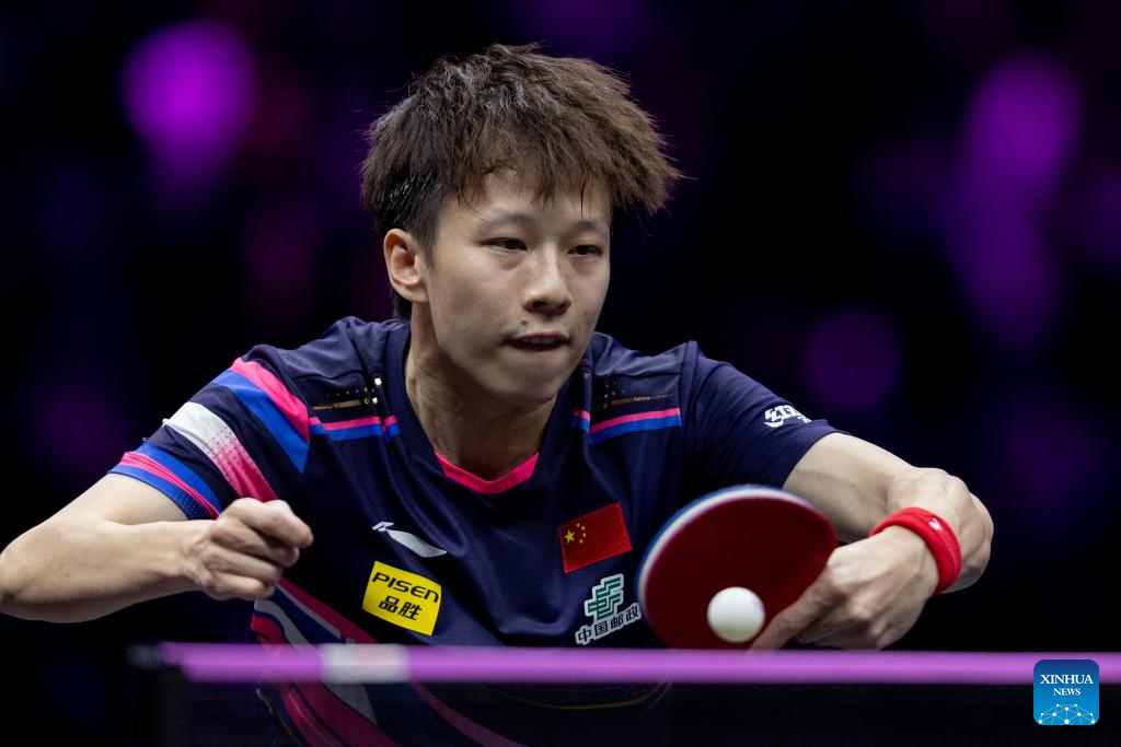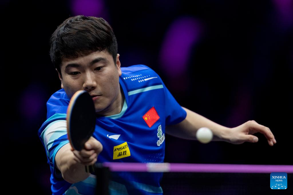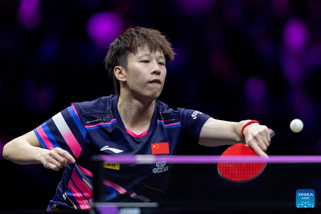 Wang Chuqin hits a return during the men's singles round of 16 match between Wang Chuqin of China and Alexis Lebrun of France at the WTT Champions Chongqing 2025 in Chongqing, southwest China, March 14, 2025. (Xinhua/Huang Wei)