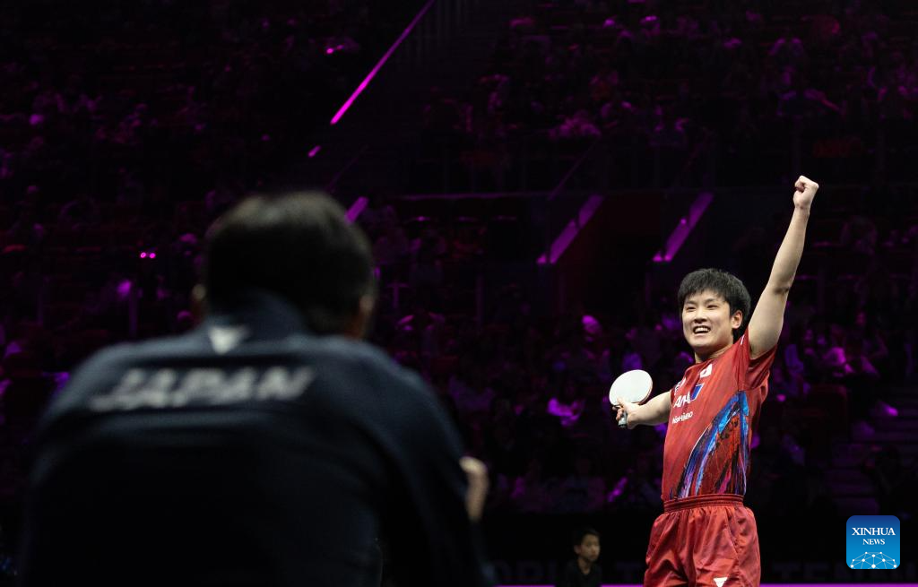 Harimoto Tomokazu (C) celebrates scoring during the men's singles round of 16 match between Harimoto Tomokazu of Japan and Anton Kallberg of Sweden at the WTT Champions Chongqing 2025 in Chongqing, southwest China, March 14, 2025. (Xinhua/Huang Wei)