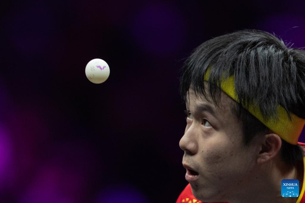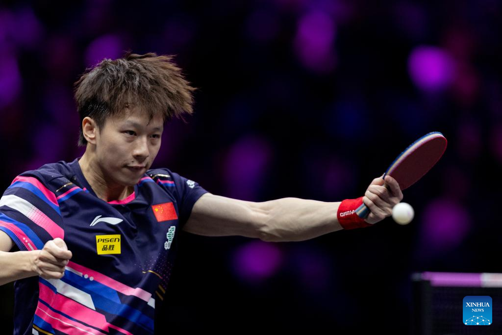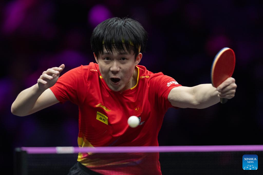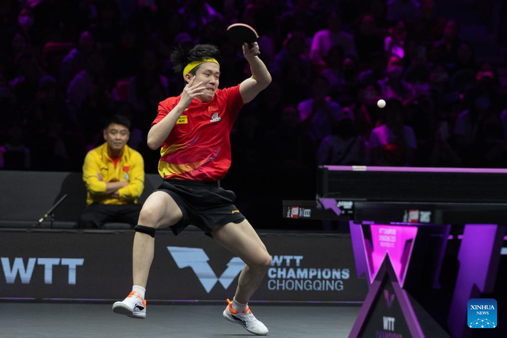 Liang Jingkun hits a return during the men's singles round of 16 match between Lin Gaoyuan of China and Liang Jingkun of China at the WTT Champions Chongqing 2025 in Chongqing, southwest China, March 14, 2025. (Xinhua/Huang Wei)