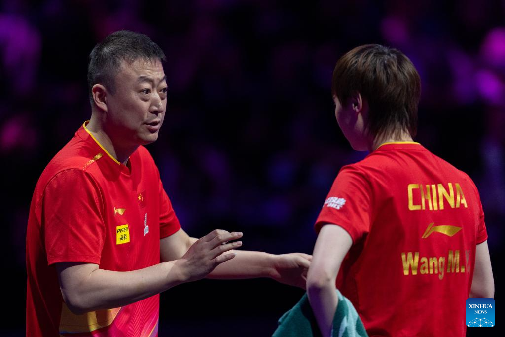 Coach Ma Lin (L) instructs Wang Manyu of China during the women's singles round of 16 match against Chien Tung-chuan of Chinese Taipei at the WTT Champions Chongqing 2025 in Chongqing, southwest China, March 14, 2025. (Xinhua/Huang Wei)