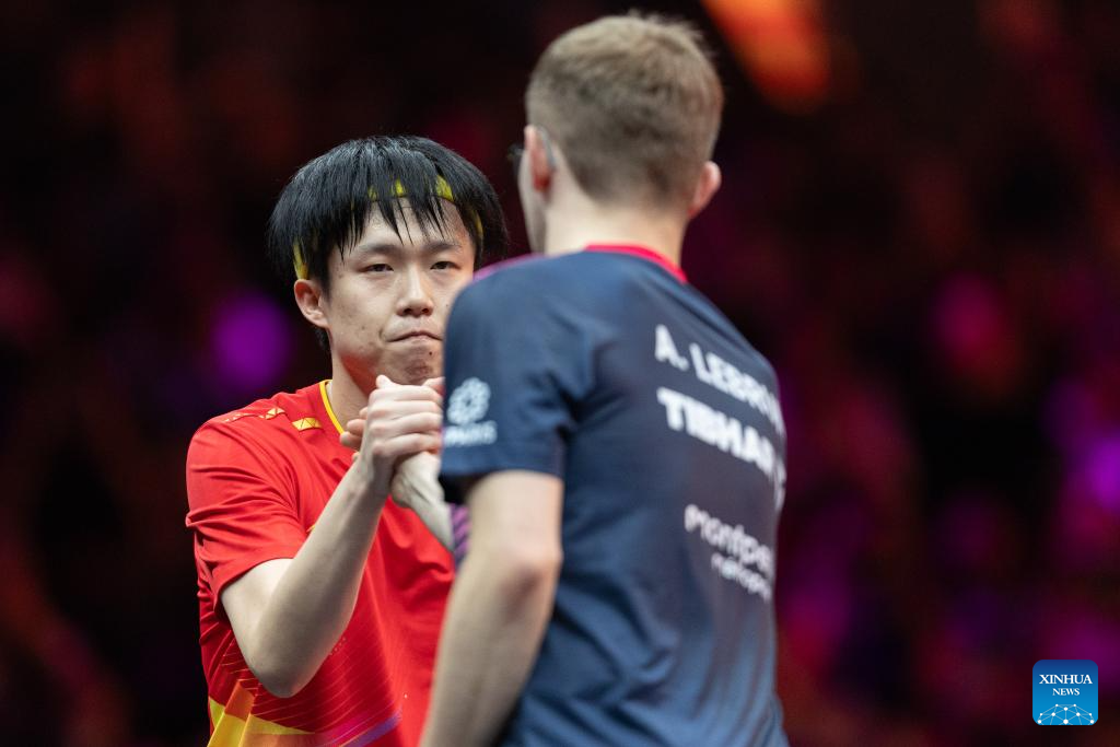Wang Chuqin (L) greets Alexis Lebrun after the men's singles round of 16 match between Wang Chuqin of China and Alexis Lebrun of France at the WTT Champions Chongqing 2025 in Chongqing, southwest China, March 14, 2025. (Xinhua/Huang Wei)