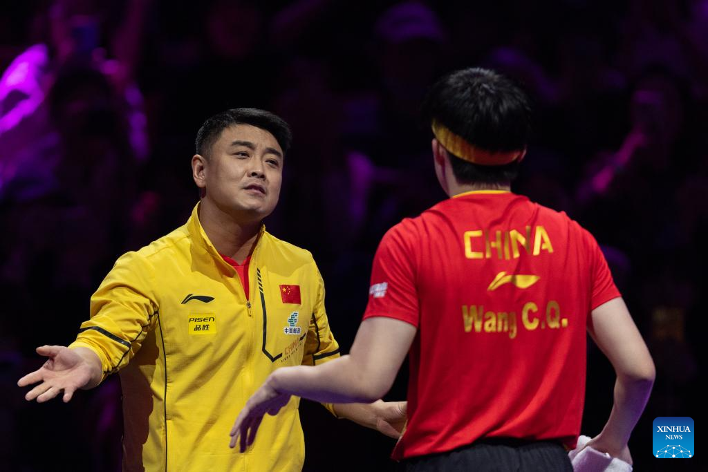 Coach Wang Hao (L) instructs Wang Chuqin during the men's singles round of 16 match between Wang Chuqin of China and Alexis Lebrun of France at the WTT Champions Chongqing 2025 in Chongqing, southwest China, March 14, 2025. (Xinhua/Huang Wei)
