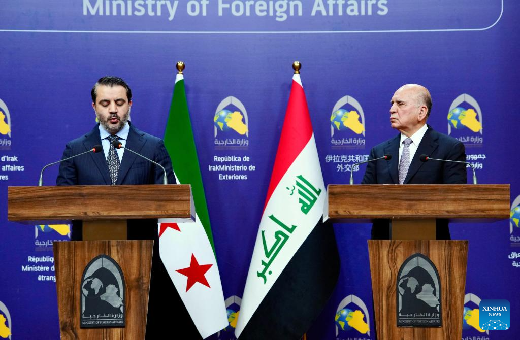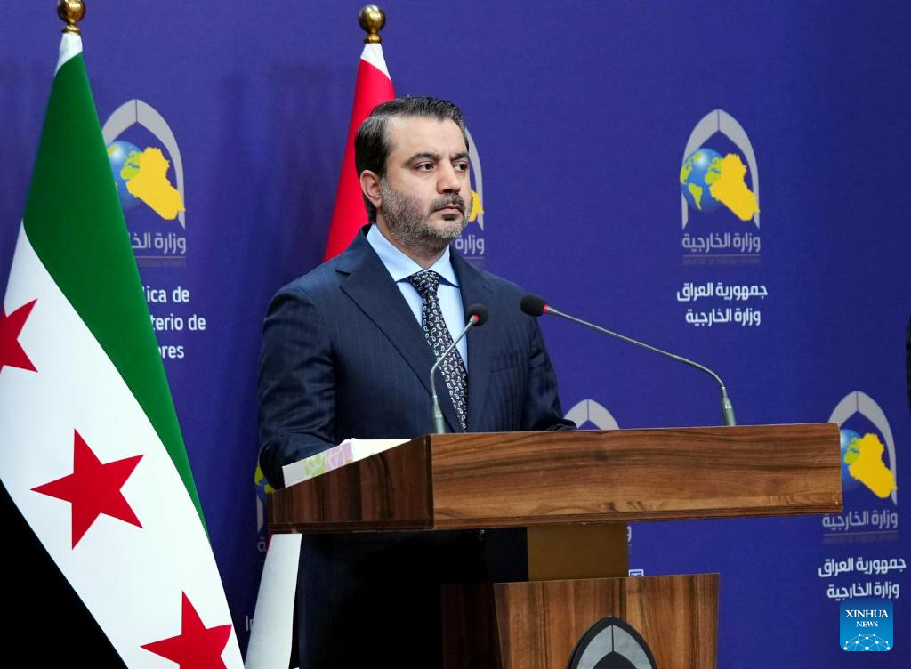 Visiting Syria's chief of foreign affairs authority Asaad al-Shaibani attends a joint press conference with Iraqi Foreign Minister Fuad Hussein (not in the picture) in Baghdad, Iraq, on March 14, 2025. Iraqi leaders met with Syria's chief of foreign affairs authority, Asaad al-Shaibani, here on Friday to discuss bilateral relations and anti-terrorism cooperation. (Iraqi Foreign Ministry/Handout via Xinhua)