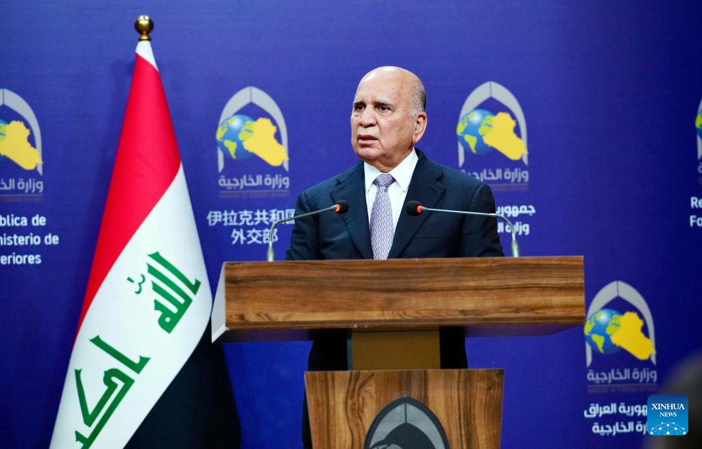 Iraqi Foreign Minister Fuad Hussein addresses a joint press conference with visiting Syria's chief of foreign affairs authority Asaad al-Shaibani (not in the picture) in Baghdad, Iraq, on March 14, 2025. Iraqi leaders met with Syria's chief of foreign affairs authority, Asaad al-Shaibani, here on Friday to discuss bilateral relations and anti-terrorism cooperation. (Iraqi Foreign Ministry/Handout via Xinhua)
