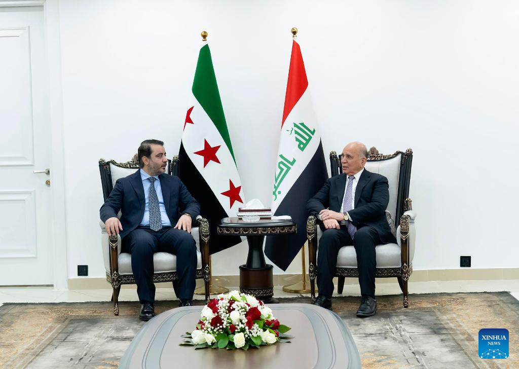 Visiting Syria's chief of foreign affairs authority Asaad al-Shaibani (L) meets with Iraqi Foreign Minister Fuad Hussein in Baghdad, Iraq, on March 14, 2025. Iraqi leaders met with Syria's chief of foreign affairs authority, Asaad al-Shaibani, here on Friday to discuss bilateral relations and anti-terrorism cooperation. (Iraqi Foreign Ministry/Handout via Xinhua)