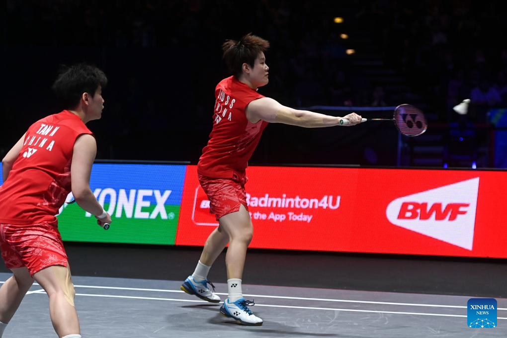 Jia Yifan (L)/Zhang Shuxian compete during the women's doubles semifinal between Jia Yifan/Zhang Shuxian of China and Fukushima Yuki/Matsumoto Mayu of Japan at All England Open Badminton Championships 2025 in Birmingham, Britain, March 15, 2025. (Xinhua/Wu Lu)