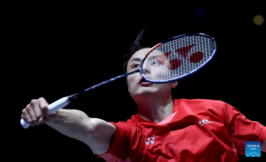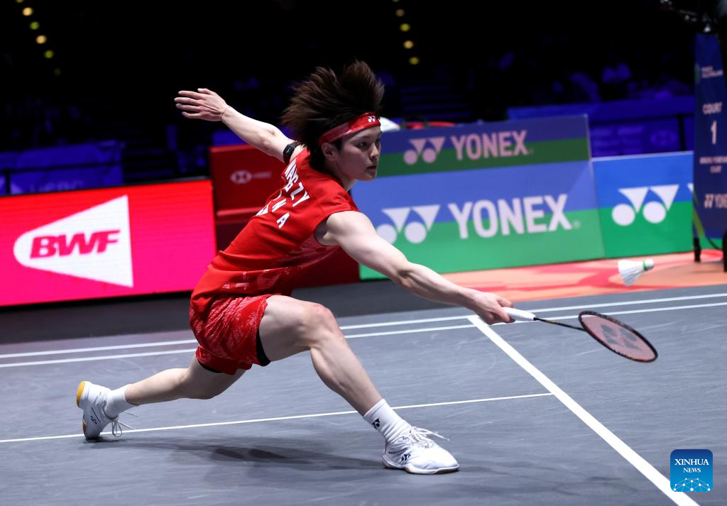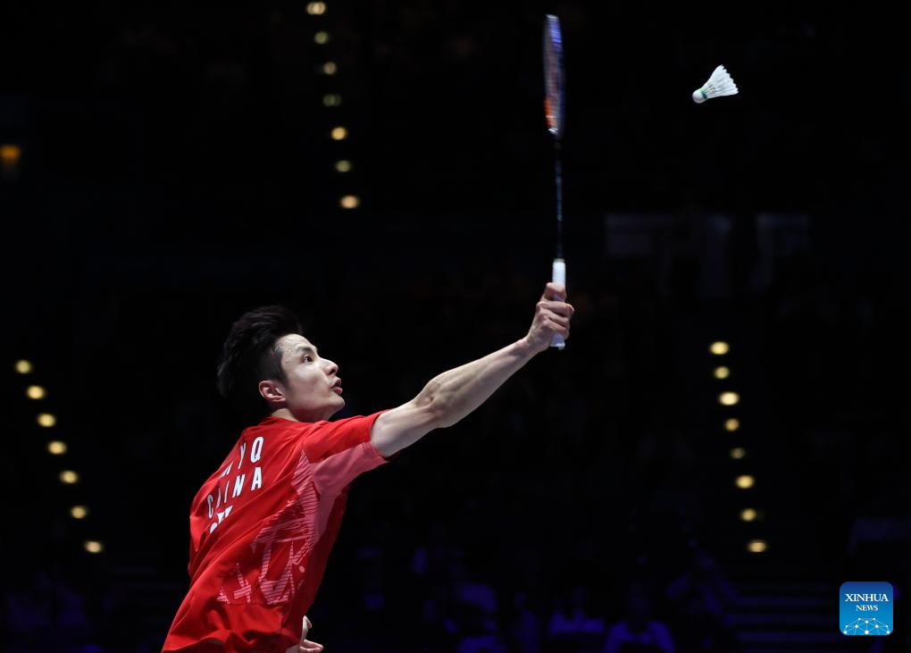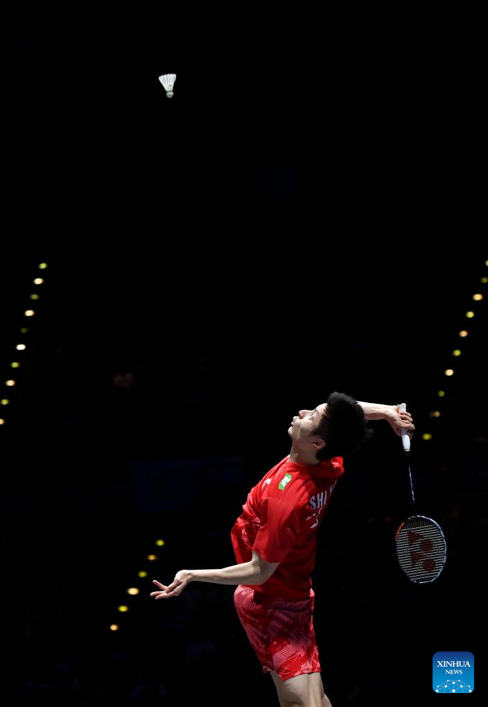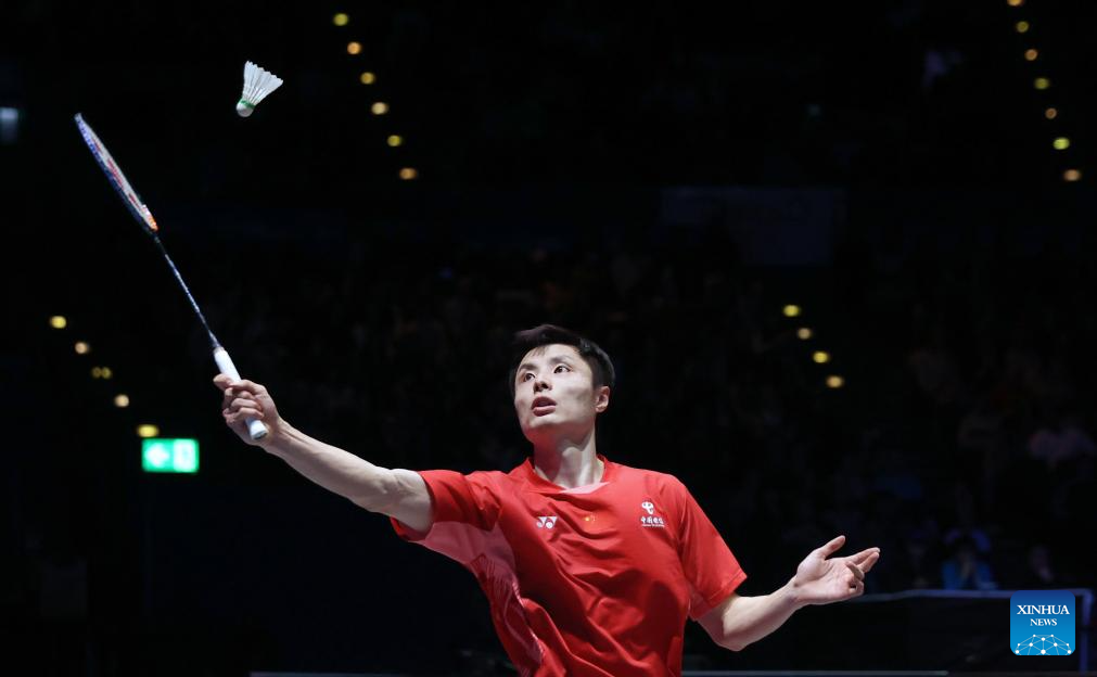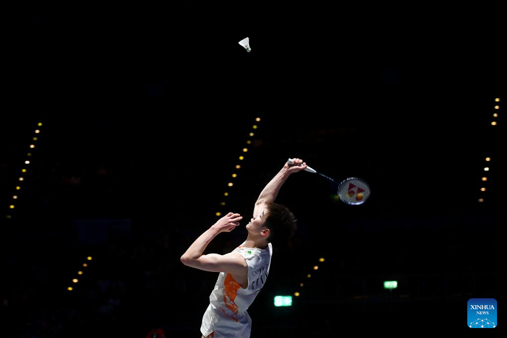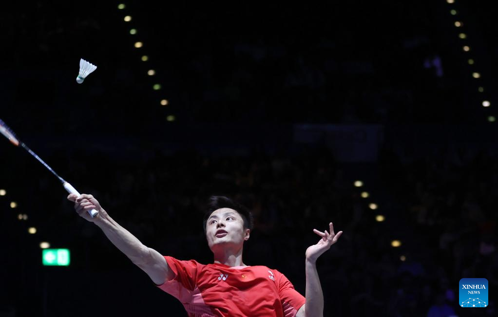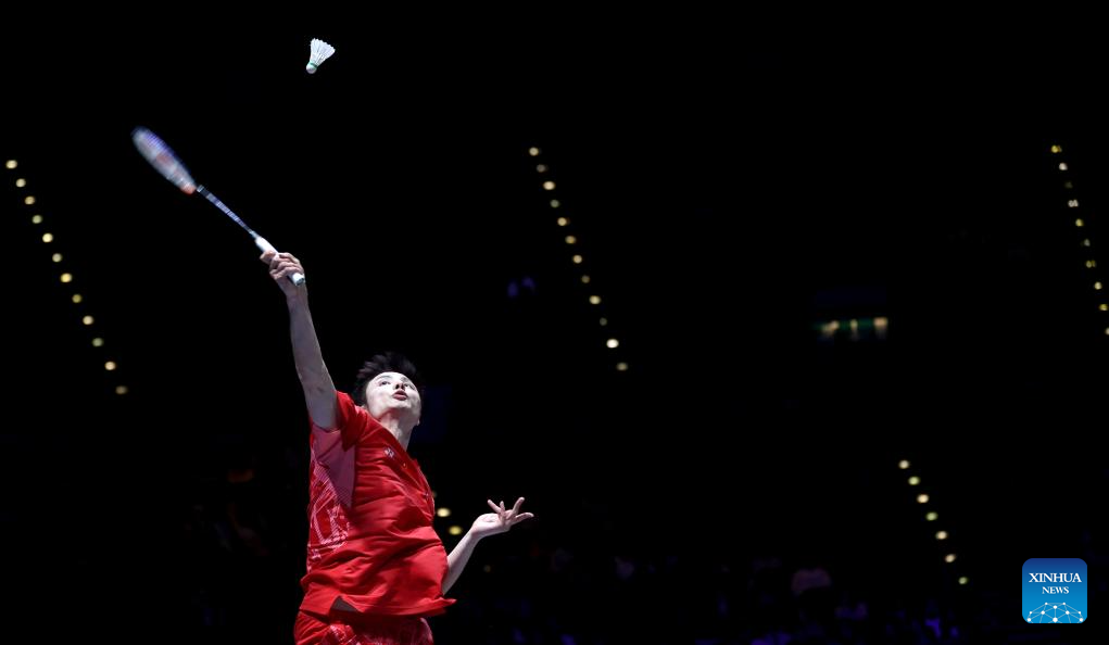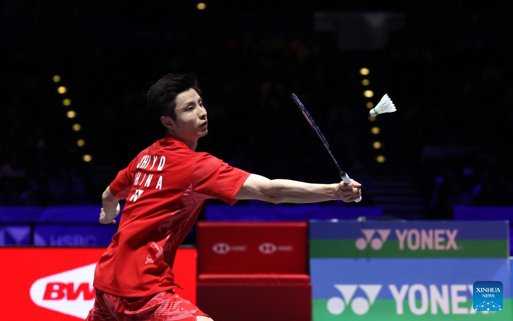 Shi Yuqi competes during the men's singles semifinal between Shi Yuqi of China and Li Shifeng of China at All England Open Badminton Championships 2025 in Birmingham, Britain, March 15, 2025. (Xinhua/Li Ying)