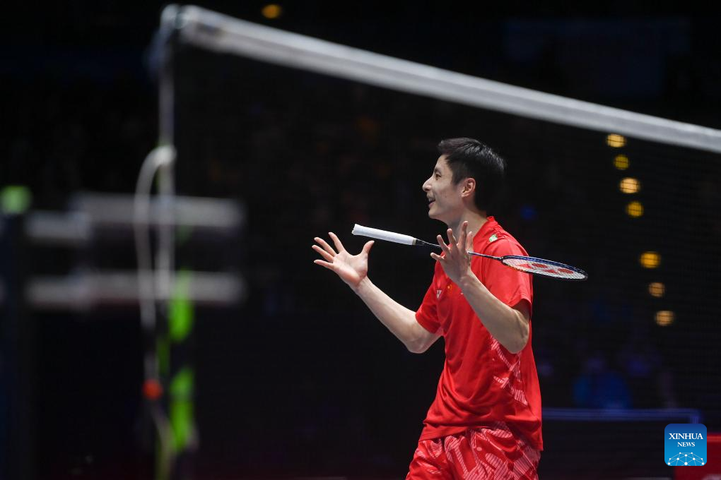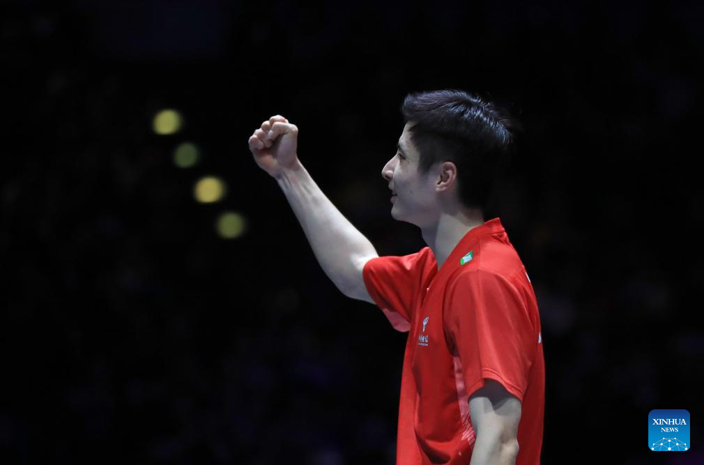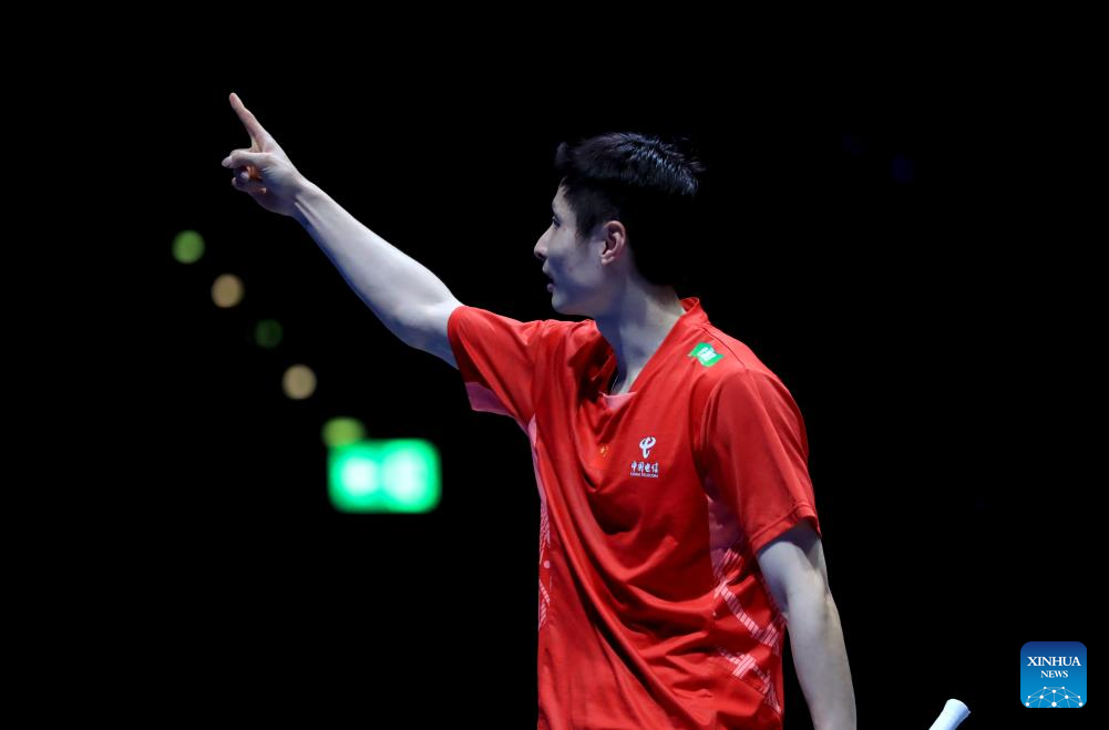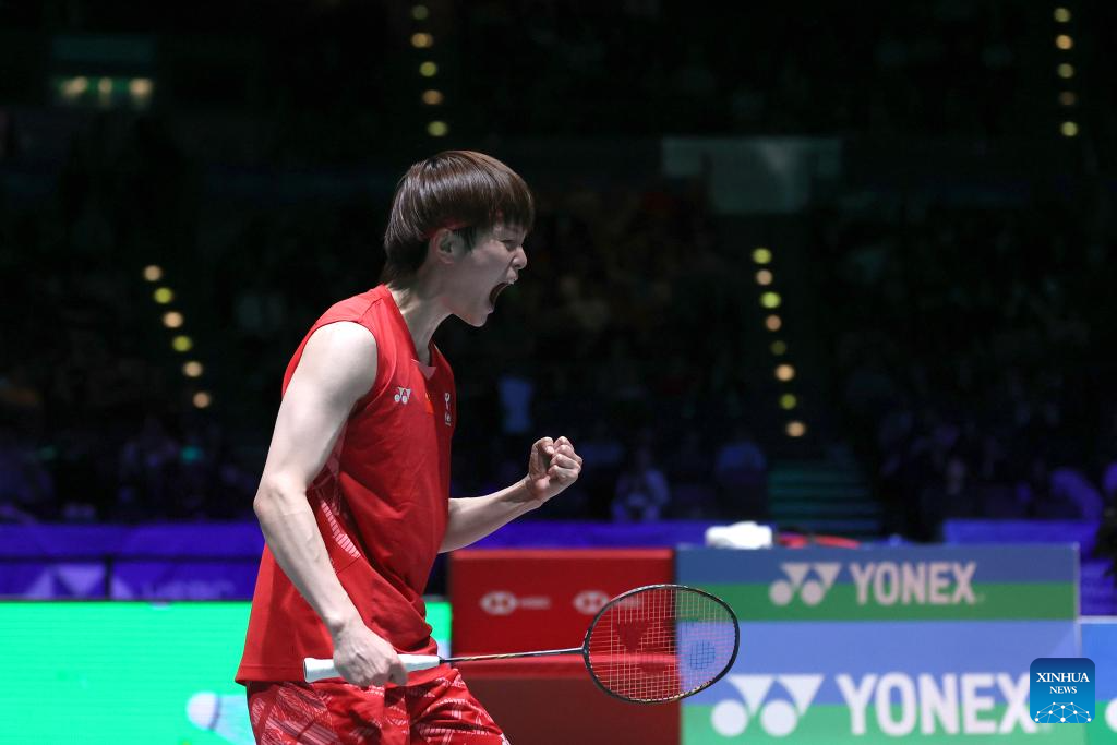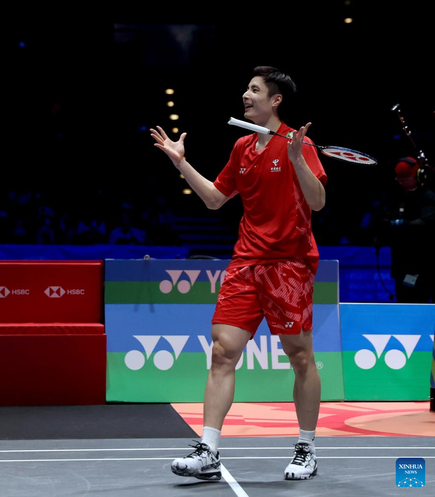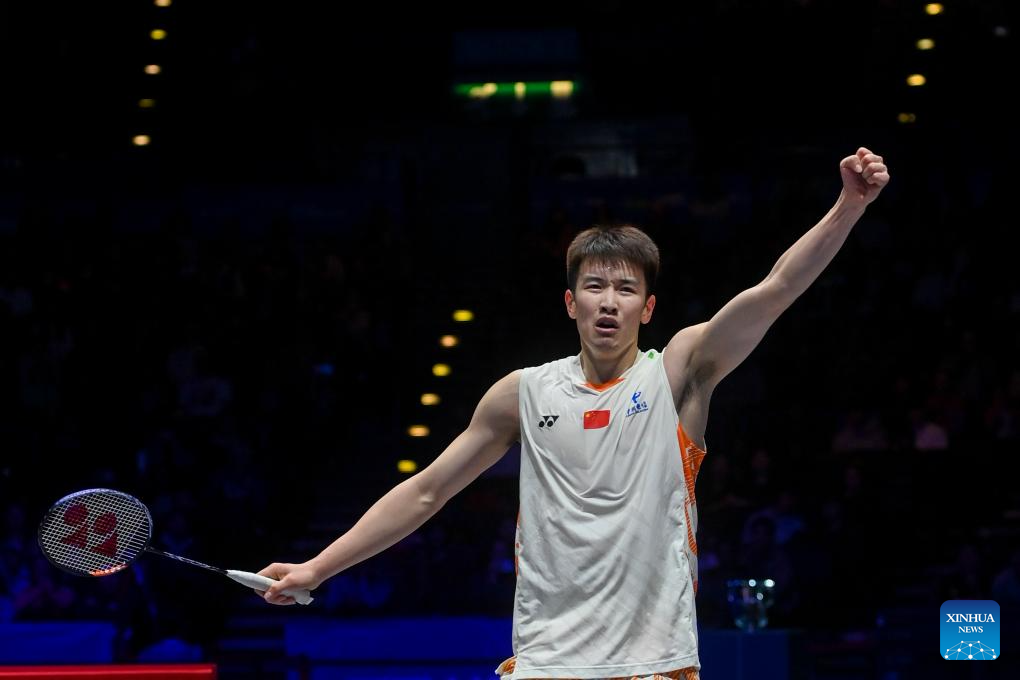 Shi Yuqi celebrates winning the men's singles semifinal between Shi Yuqi of China and Li Shifeng of China at All England Open Badminton Championships 2025 in Birmingham, Britain, March 15, 2025. (Xinhua/Li Ying)