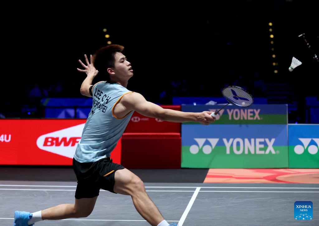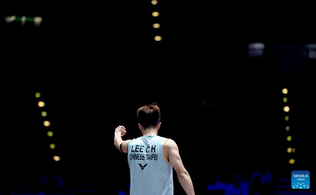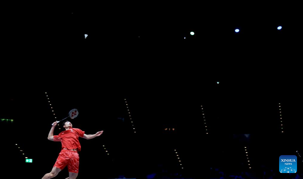 Lee Chia Hao hits a return during the men's singles semifinal between Lee Chia Hao of Chinese Taipei and Alex Lanier of France at All England Open Badminton Championships 2025 in Birmingham, Britain, March 15, 2025. (Xinhua/Li Ying)