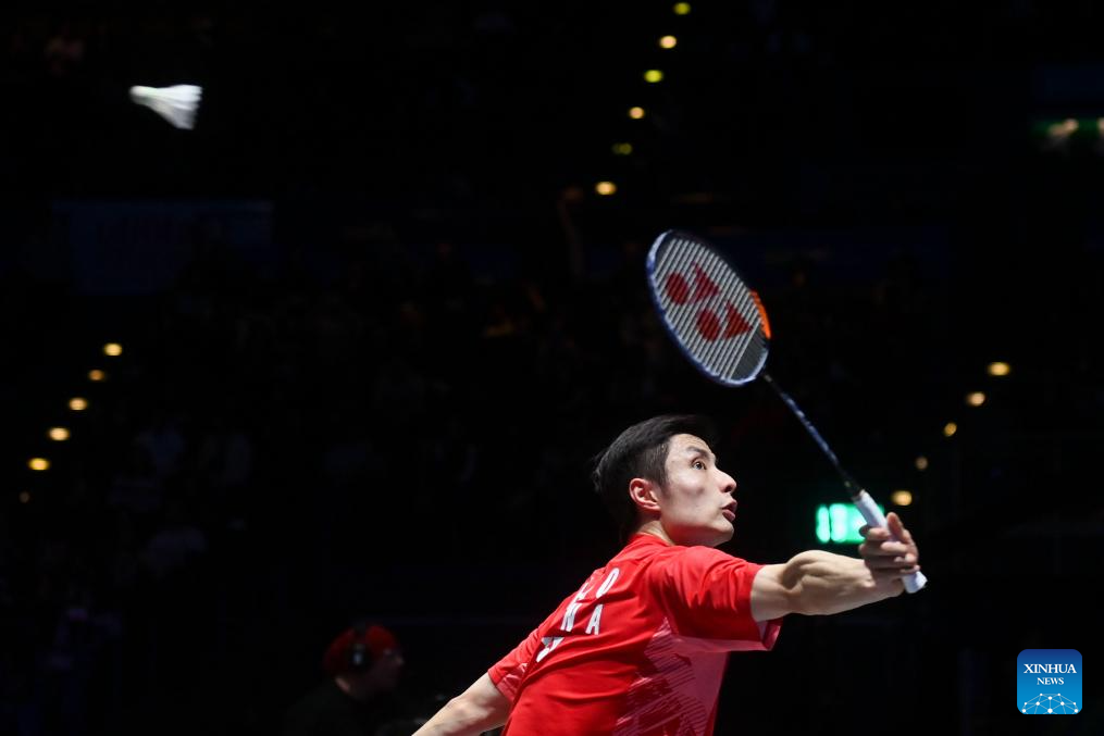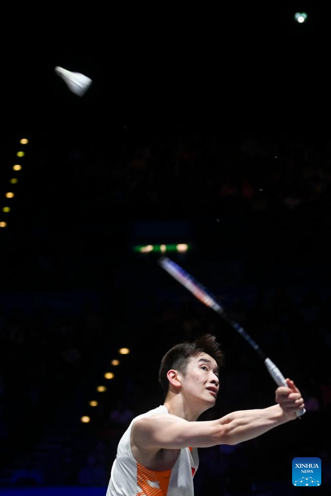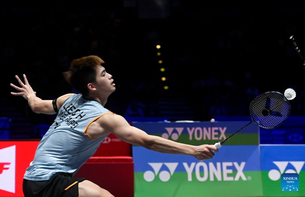 Lee Chia Hao hits a return during the men's singles semifinal between Lee Chia Hao of Chinese Taipei and Alex Lanier of France at All England Open Badminton Championships 2025 in Birmingham, Britain, March 15, 2025. (Xinhua/Wu Lu)