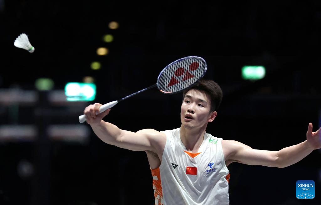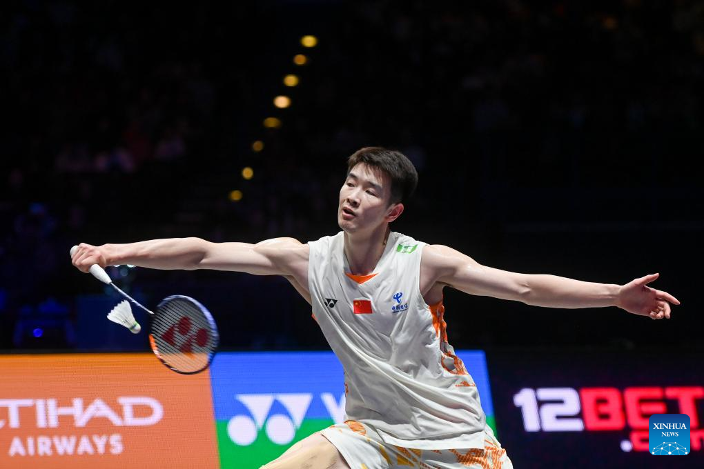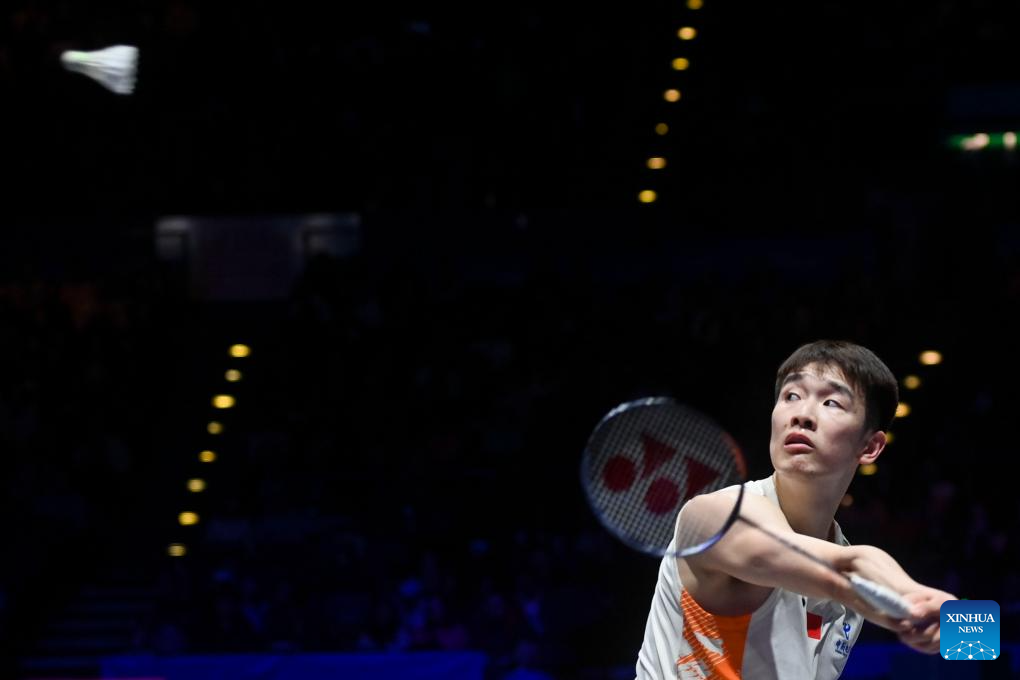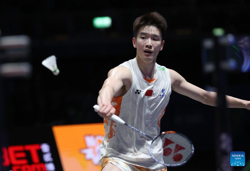 Li Shifeng hits a return during the men's singles semifinal between Shi Yuqi of China and Li Shifeng of China at All England Open Badminton Championships 2025 in Birmingham, Britain, March 15, 2025. (Xinhua/Wu Lu)