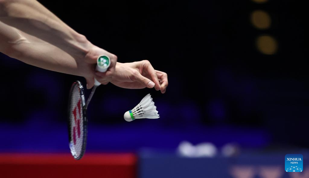 Shi Yuqi serves during the men's singles semifinal between Shi Yuqi of China and Li Shifeng of China at All England Open Badminton Championships 2025 in Birmingham, Britain, March 15, 2025. (Xinhua/Li Ying)
