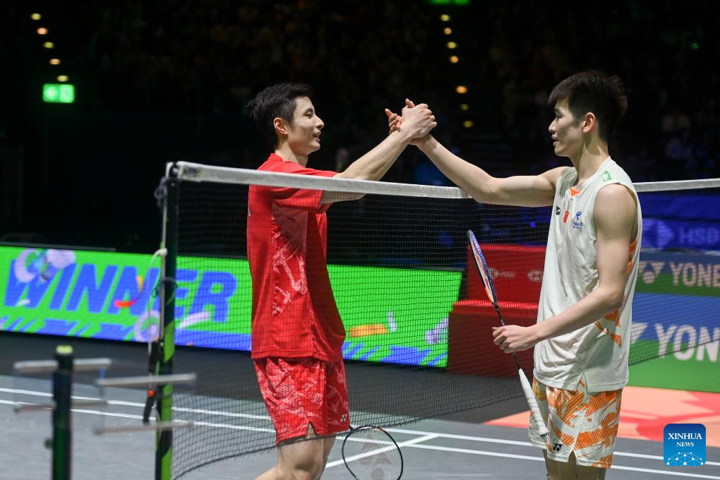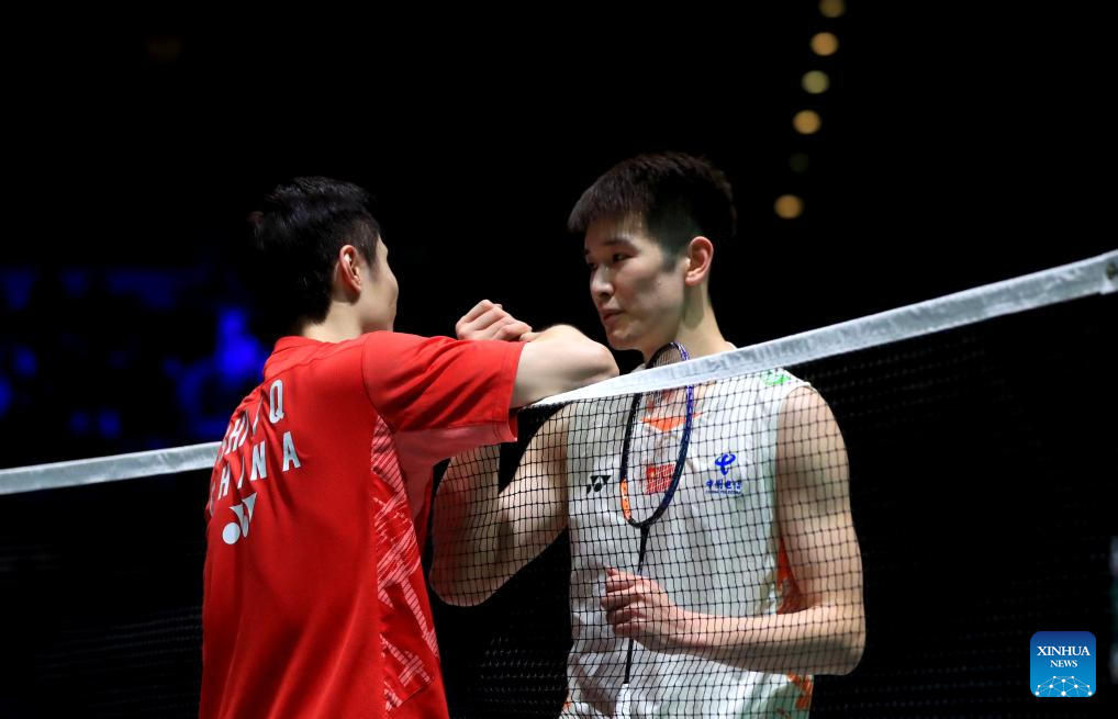 Shi Yuqi (L) greets Li Shifeng after the men's singles semifinal between Shi Yuqi of China and Li Shifeng of China at All England Open Badminton Championships 2025 in Birmingham, Britain, March 15, 2025. (Xinhua/Li Ying)