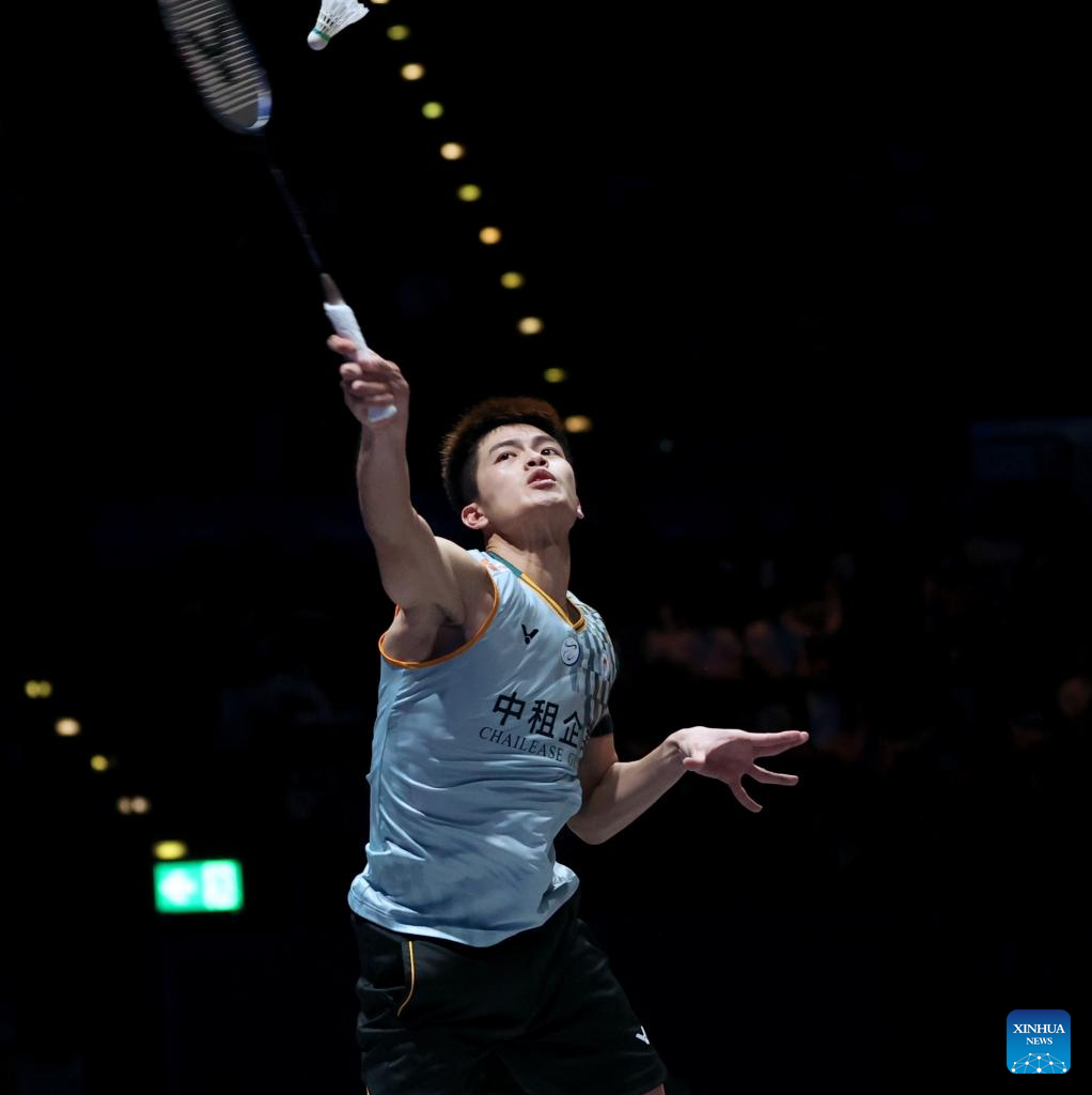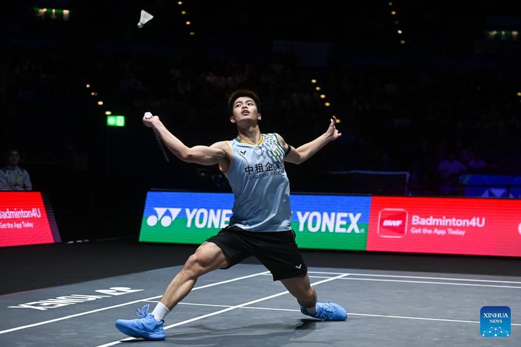 Li Shifeng hits a return during the men's singles semifinal between Shi Yuqi of China and Li Shifeng of China at All England Open Badminton Championships 2025 in Birmingham, Britain, March 15, 2025. (Xinhua/Li Ying)