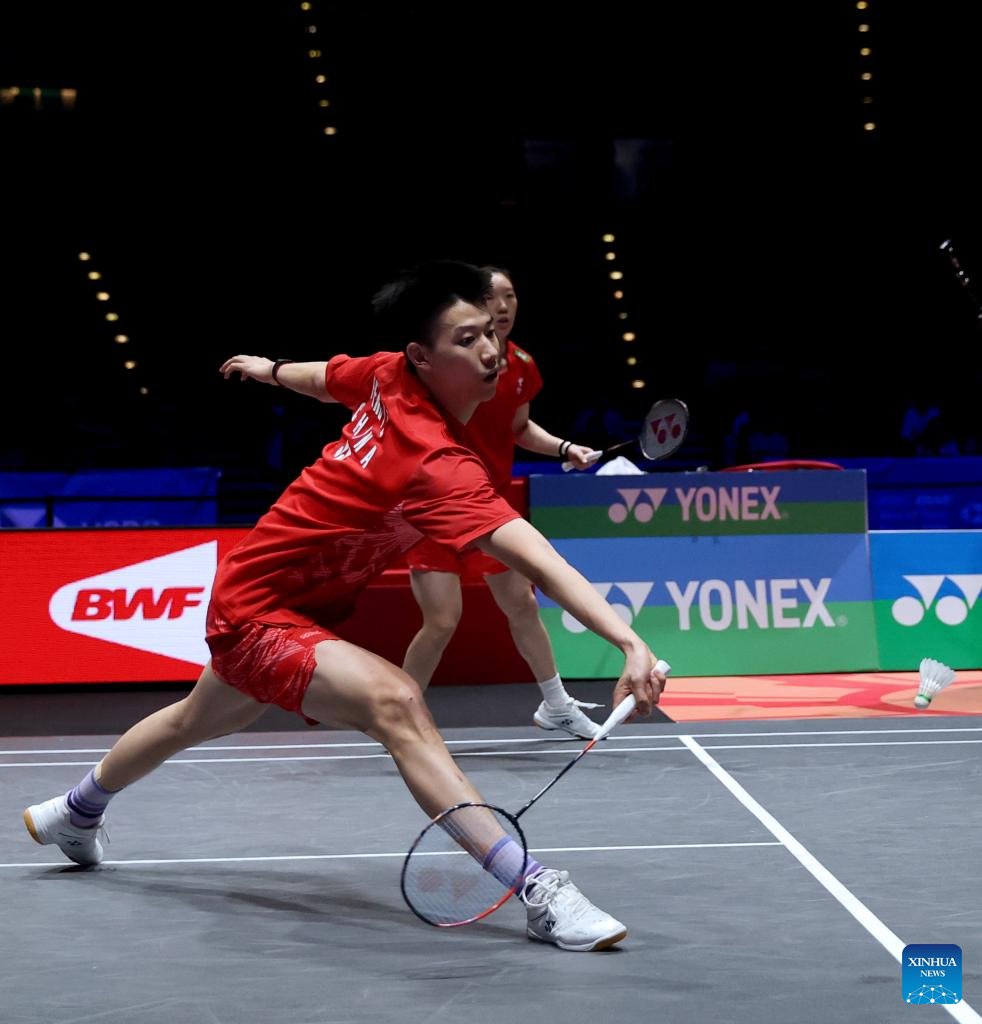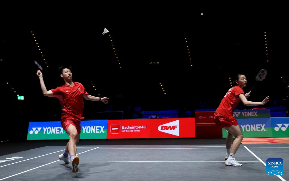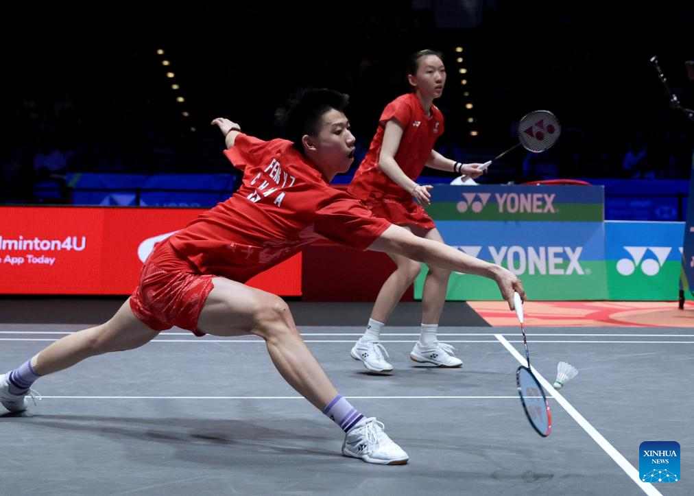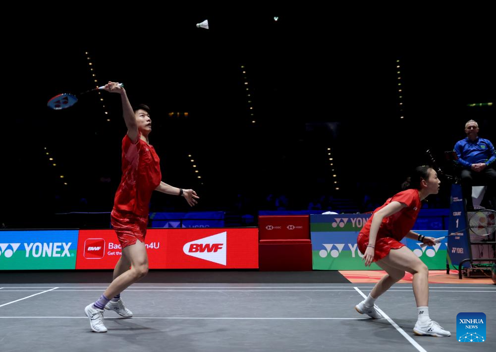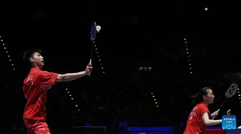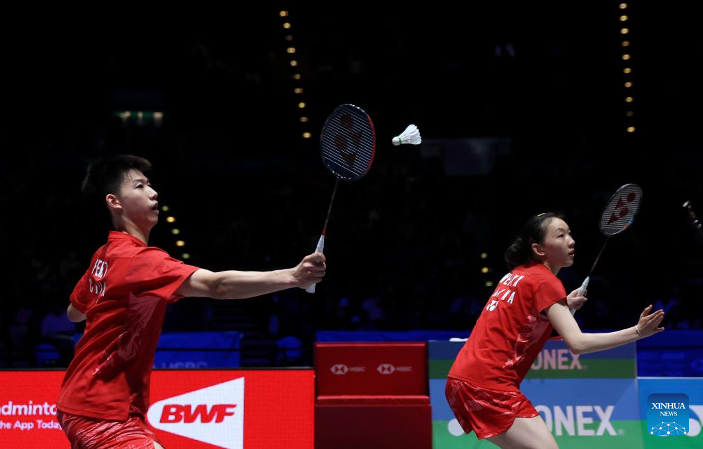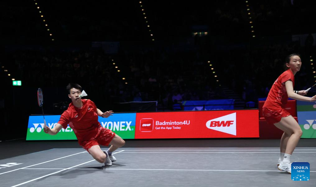 Feng Yanzhe (L)/Wei Yaxin compete during the mixed doubles semifinal between Feng Yanzhe/Wei Yaxin of China and Lee Jong Min/Chae Yu Jung of South Korea at the All England Open Badminton Championships 2025 in Birmingham, Britain, March 15, 2025. (Xinhua/Li Ying)