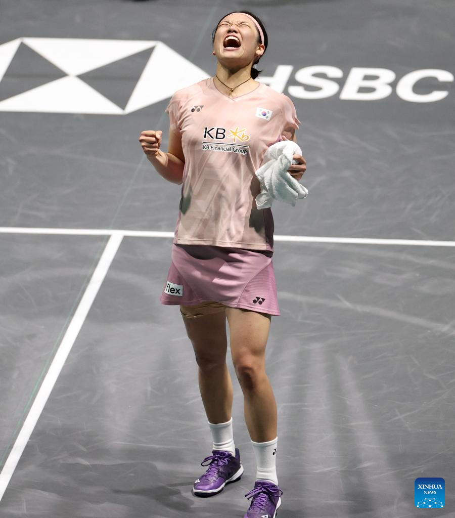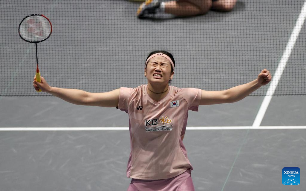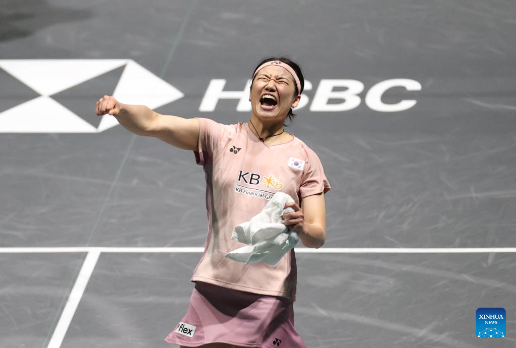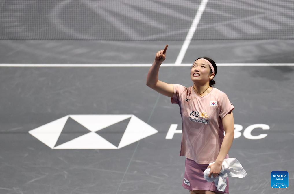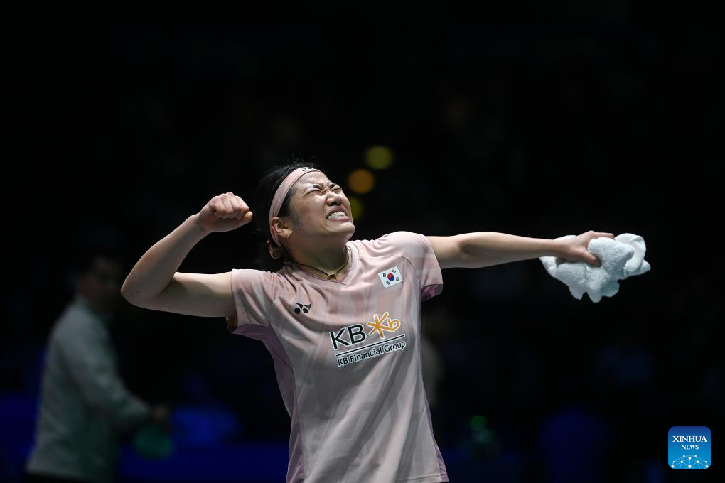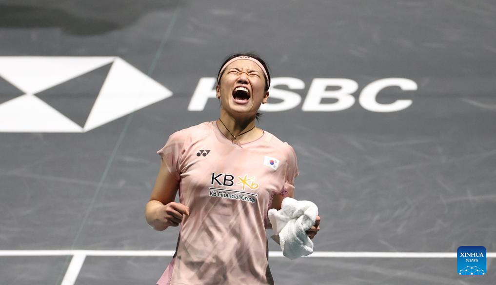 An Se Young celebrates after winning the women's singles semifinal between An Se Young of South Korea and Yamaguchi Akane of Japan at the All England Open Badminton Championships 2025 in Birmingham, Britain, March 15, 2025. (Xinhua/Li Ying)